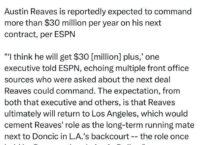 据ESPN报道,里夫斯预计将在下一份合同中要求年薪超过3000万美元。 “我认为他会拿到3000万美元以上的合同,”一位球队高管告诉ESPN,这与多位球队管理层消息人士的预期一致。无论是这位高管还是其他消息源都认为,里夫斯最终将重返洛杉矶,这将巩固他作为东契奇在洛杉矶后场的长期搭档地位——这一角色此前曾在达拉斯由布伦森和欧文先后担任。