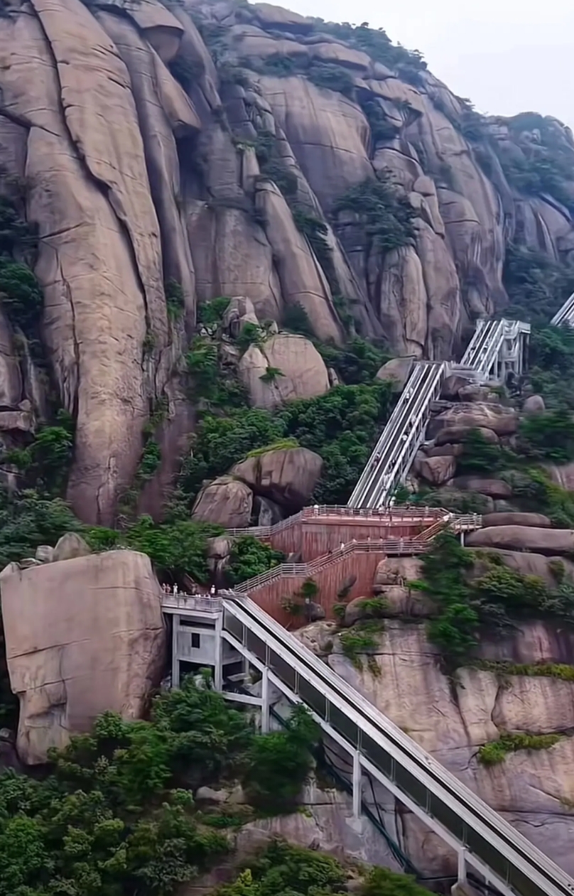 上饶灵山,1.3亿元投资5级共10段电梯,长度1.几公里,高度差223米相当于88层楼高,目前免费。