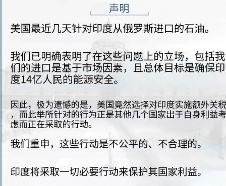 印度再次对美国发出严正声明:“美国最近几天针对印度从俄罗斯进口的石油。我们已明确表明了在这些问题上的立场,包括我们的进口是基于市场因素,且总体目标是确保印度14亿人民的能源安全。 因此,极为遗憾的是,美国竟然选择对印度实施额外关税,而此举所针对的行为正是其他几个国家出于自身利益考虑而正在采取的行动。我们重申,这些行动是不公平的、不合理的。印度将采取一切必要行动来保护其国家利益。”——北京时间8月6日晚
