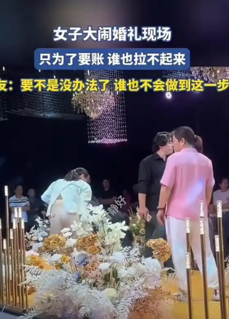 所以才有了那一幕:她冲上舞台,跪在中间大哭,任谁拉也不走,反复喊着要还钱,新郎父亲脸色很难看,想让她等婚礼结束后再说,但她不信了,她觉得这是自己唯一能逼他还钱的机会。