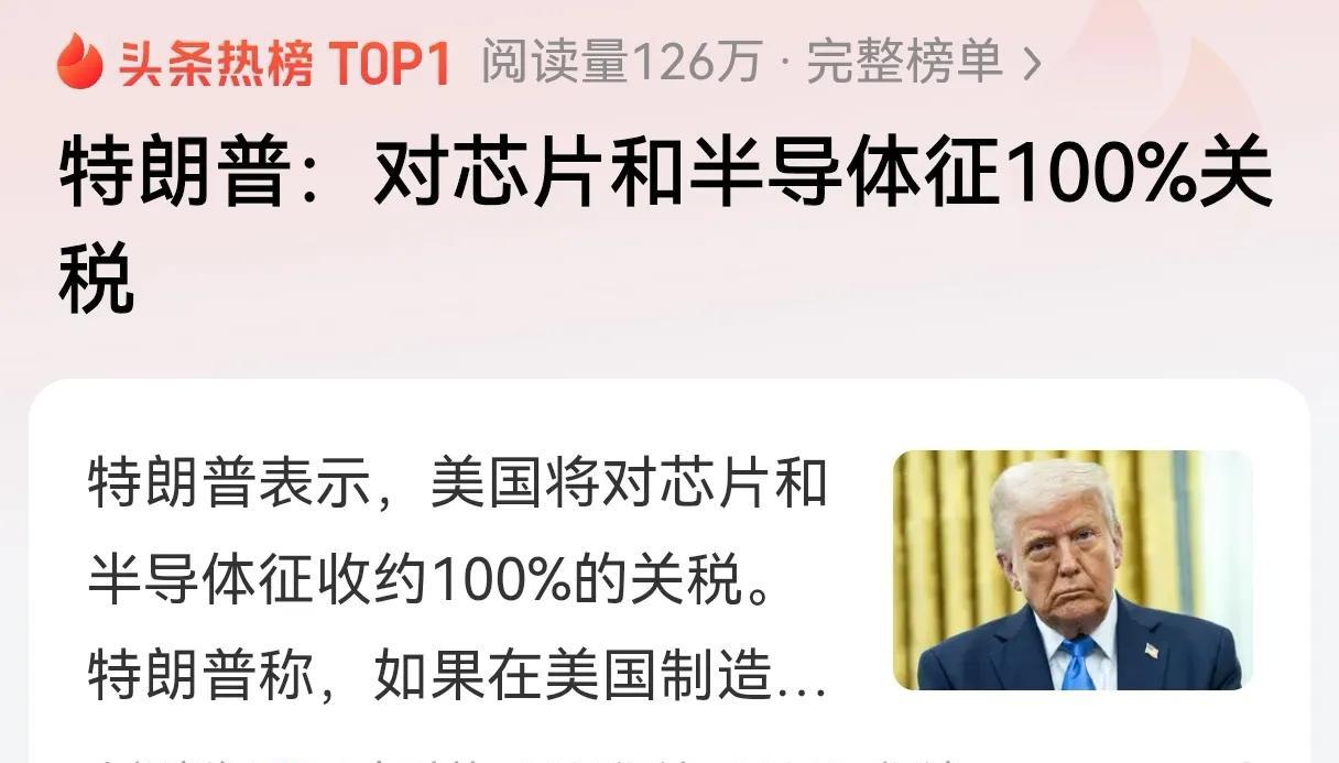 秦安:第三波!一夜醒来,特朗普将对芯片加征100%关税,药品250%,印度25%,中国不要担心。#头号创作者激励计划# 特朗普继续疯狂,在对印度额外加征25%关税,将对进口药品征收“小额关税” 后续税率将升至250%之后,又将对芯片和半导体征收约100%的关税。#特朗普:对芯片和半导体征100%关税# 当地时间8月6日,特朗普放出这个消息,并明确,如果在美国制造,将不收取任何费用。 回顾特朗普的“关税核弹”,第一波是针对中国的疯狂,但中国丝毫不让步,在加征到125%,几乎完全切断中美贸易后,中国不再跟着做数字游戏,而是祭出“稀土出口管制”大招,中美暂时偃旗息鼓,进行谈判状态。 第二波,对各国以最后通牒方式确定关税,巴西50%,阿根廷39%,菲律宾19%,日韩15%,但基本上绕开中国,中美互加关税延迟90天,继续谈判,美国务卿认为中美进入“战略相持阶段”。 第三波,药品逐渐增加到250%,以及芯片和半导体的100%。这其中,并没有明确对中国豁免,就有一个中国跟不跟的问题。但有一点可以肯定,中国台湾地区的芯片将被迫更多向美国转移。 从目前看,特朗普对芯片加征100%关税、对药品加征250%关税,包括中国 。特朗普明确所有进口至美国的芯片和半导体都要征收100%的关税,未提及排除中国 。在药品方面,他也未表示对中国有例外,且此前中美贸易摩擦中,美国已对中国多种产品加征关税,所以此次涉及芯片和药品的关税政策应会涵盖中国。 目前,没有确切公开数据显示中国中低端芯片出口到美国的具体量,但有数据表明2024年中国半导体产品对美国出口总金额为231.4亿元,占中国半导体产品出口总金额1.5万亿元的不足2% 。2024年中国集成电路出口额达1595亿美元(约1.156万亿元),假设这1.156万亿元近似为上述所说的芯片出口额,那么中国对美国芯片出口额占比约为2% 。因中国出口的多为中低端芯片,所以可大致认为中低端芯片出口美国的金额占比也在这一水平左右。 因此,这个对芯片加征100%关税,对中国大陆影响不大,但会要了台积电的命! 中国出口到美国的药品方面,美国是中国第一大药品出口国,原料药是主要出口产品。2024年中国1079.64亿美元医药出口中,西药类占比近一半,其中原料药占西药类的80%左右,美国主要药品近30%原料来自中国。加征关税影响较大,但如果导致中美药品贸易停止,美国没有了30%的原料药,自己的药企也扛不住。 这类似于帮中国出台“药品原料出口管制”,尽管和“稀土出口管制”不同,反噬也不会小。 按道理说,既然特朗普明确中美关税加征延迟90天,选在有在单个领域加征高额关税,对中国是出尔反尔,但考虑到目前特朗普依然是口头威胁,不妨让子弹飞一会儿,综合分析其第三波疯狂的综合影响。先看看美国药企等的承受能力如何!#秦安战略# 特朗普:>>