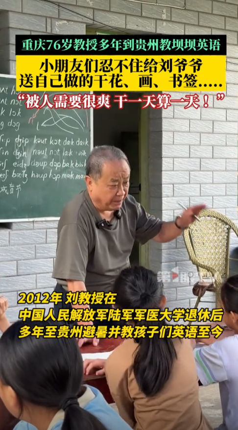 这名老师火了!”重庆一退休老教授到贵州避暑时,发现一群山区孩子英语教学跟不上,于是将农家院改成“坝坝英语角”,坚持免费为孩子们辅导英语13年,面对采访,老教授说了这样一番话,让人听了为之动容,网友:这是老一辈军人的无私奉献的情怀! 根据第一眼新闻8月6日的报道,这位老人名叫刘晓生,来自重庆,是中国人民解放军陆军军医大学的退休教授。 当地的孩子都亲切地叫他“教授爷爷”,而他的“坝坝英语”培训班视频在网上火了之后,网友们纷纷被这份坚持与奉献打动。 事情要从2011年说起,刘晓生和家人到桐梓县海校街道水井社区避暑,在一次晚饭后串门时,刘晓生到老乡家闲聊,得知老乡家孩子正上初中,便让孩子读一段英文给他听。 可孩子那蹩脚、不标准甚至错误的发音,让身为英语教师的刘晓生心里很不是滋味,当即决定要为孩子纠正和指导发音。 起初,他只是在走廊上为这几个孩子补英语,但乡亲们口口相传,附近村民知道后,纷纷把自家孩子送到刘晓生这里。 一开始,教学条件十分简陋,没有桌子板凳和黑板,村民们便凑钱添置,随着学生人数不断增加,一户村民慷慨地让出自家院坝作为上课场所,“坝坝英语”课堂就此正式扎根。 从那以后,每年夏天,刘晓生都会如约来到桐梓,他的学生从小学生到高中生都有,人数最多的时候达到了120人。 为了达到更好的教学效果,他精心编排课程表,一周六天,每天4小时授课,这个强度远超他退休前的教学工作量。 他还针对不同年龄段学生设计课程内容,采用分班教学模式,小学生主要培养书写、拼读和记单词的能力,中学生则强调分析句子结构。 他希望在有限的时间里,解决孩子们平时学习英语的困惑,教授他们学习英语的方法。 在教学过程中,刘晓生还想出各种办法帮助孩子们学习,他特意制作了音标的小卡片,帮助学生记住音标,从而更好地朗读英语。 随着学生增多,场地也多次更换,最初“坝坝英语”在农户周昌英家院坝开课,遇刮风下雨就搬进房间。 后来学生越来越多,周昌英主动把放打米机的房间腾出来,家长们凑钱买了黑板和课桌椅,可即便如此,小小的教室还是被挤满,最终“坝坝英语”又回到了坝子上。 13年过去了,参加培训的大部分孩子英语成绩都有明显提高,村里考出去的不少大学生,都曾听过“坝坝英语”。 刘晓生的第一个学生如今已研究生毕业,看着孩子们的成长与进步,家长们十分感激,有的自发送来鸡蛋、蔬菜等,还有的想掏点学费表心意,但刘晓生一概拒收。 他说:“我做这些不为钱,能得到乡亲的认可,跟他们相处得跟一家人一样,就是我最大的快乐。” 当被问及为何古稀之年仍如此倾力时,刘晓生的回答朴素而刚毅:“我既是军人,也是教师。” 1970年,凭借拔尖的英语成绩,他应征入伍,成为部队特招的外语人才,1976年学成后,便走上某部训练大队的讲台,开启三十余载的军旅教学生涯。 教学路上,父母“为人民服务”以及“不脱离群众”的言传身教,成了他一生的精神坐标。 他教出的学生里,有中国科学院院士,有将军,更有众多在各自领域默默奉献的专家教授,可他依然觉得,能在退休后为山区孩子做点事,是特别有意义的。 网友们看到刘晓生教授的事迹后,感动不已,有人说:“这才是真正的教育者,用自己的行动诠释着对教育的热爱和对社会的责任。” 还有人感慨:“老一辈军人的无私奉献情怀,在刘教授身上体现得淋漓尽致,太令人敬佩了。” 的确,在偏远农村地区,教育资源相对匮乏,英语教学更是薄弱环节,刘晓生教授的“坝坝英语角”,就像一道光照进了孩子们的世界,为他们打开了一扇通往外面世界的窗户,让他们接触到更标准的发音、更系统的语法,激发了他们对英语学习的兴趣。 这不仅仅是知识的传授,更是梦想的点燃,是用爱与坚持为山区孩子铺就一条成长之路。 刘晓生教授13年如一日的坚守,展现出的是无私奉献、心怀大爱的高尚品质,他用行动书写着对教育事业的执着,诠释着为人民服务的初心。 相信他的事迹会激励更多人关注乡村教育,也期待有更多像刘晓生教授这样的人,为山区孩子的未来带来更多的希望与可能。 大家对此有什么看法呢?欢迎在评论区留言讨论。