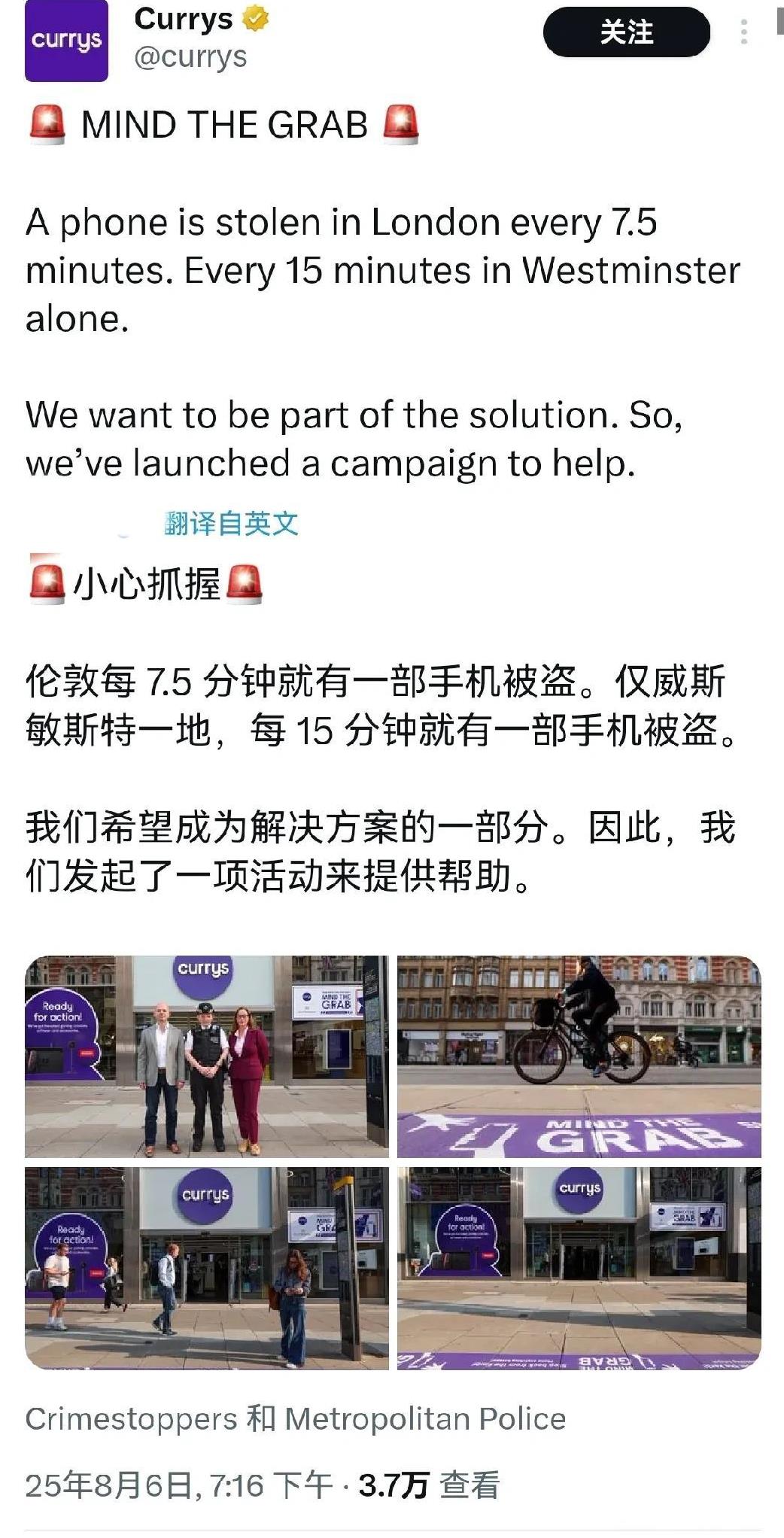 英国伦敦街头最近飞车贼抢手机猖獗,不少情况还是骑着自行车对看手机的路人实施的。每7.5分钟,伦敦街头就有一部手机被抢走。 ——猜猜聪明的英国人是如何解决这个问题的? 他们选择了主动提醒市民不要在人行道上看手机:伦敦市联合英国知名消费电子电商Currys,将大大的【Mind the Grab】紫色标语贴在路面上! 好好好,飞车贼不追了,让所有人不用手机问题不就解决了吗?真是大聪明啊。