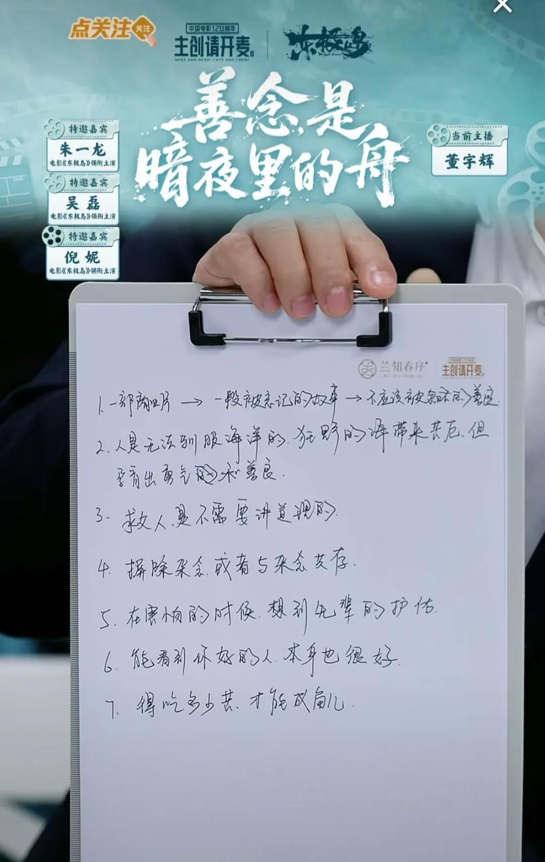 昨天晚上的访谈非常成功,与辉同行执行力很强,首先背景换掉了,换成巨幅海报,蓝色的海水非常清新。桌子也从之前的圆桌和椅子换成了长条桌,这样更亲近。前面是木质船和海浪,后面是深蓝的大海,整个布景紧扣主题,色彩搭配的也很统一,协调。 开播前一小时卖货引流,8点宇辉他们上播以后挂了小房子和蓝色小雪花。连宇辉写总结的纸上角也印上了兰知春序和主创请开麦。这些都是上次访谈结束后大家给的建议,宇辉一一收入并全面整改。 昨晚的访谈6位老师都很健谈,梁静老师居然是最早的一批丈母娘,太开心了。管虎和黄震翔老师都是资深导演,拍《东极岛》也是老师一直以来的心愿,现在终于达成。当目标坚定终究水到渠成。 三位演员倪妮昨晚的谈吐让我刮目相看,她的语言表达能力很强,很温婉,很清晰,准确,精炼而友好,应该看过不少书,而且有很好的教养。朱一龙也很健谈,对剧本对人物的理解都很深入,而且情商很高,原来以为他不善言辞,没想到很亲和很能聊的开。磊磊是宇辉的好朋友,宇辉对磊磊就像弟弟一样,知道他喜欢吃蓝莓,公司没有,还特意出去买了蓝莓给磊磊吃。磊磊昨天说一句降本增效引起一片笑声。 昨天访谈的氛围非常好,我买了三张票支持《东极岛》,朱一龙粉丝和吴磊的粉丝也对丈母娘频频感谢!智慧的人都是互相成就。