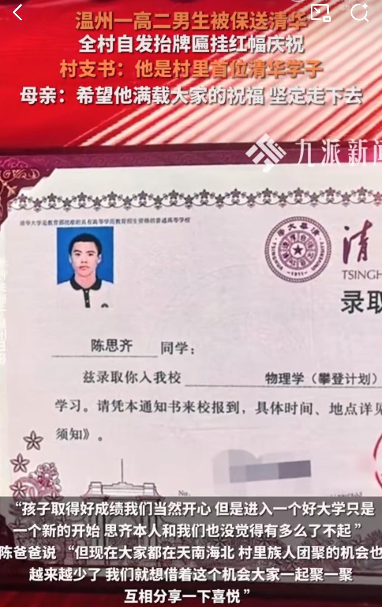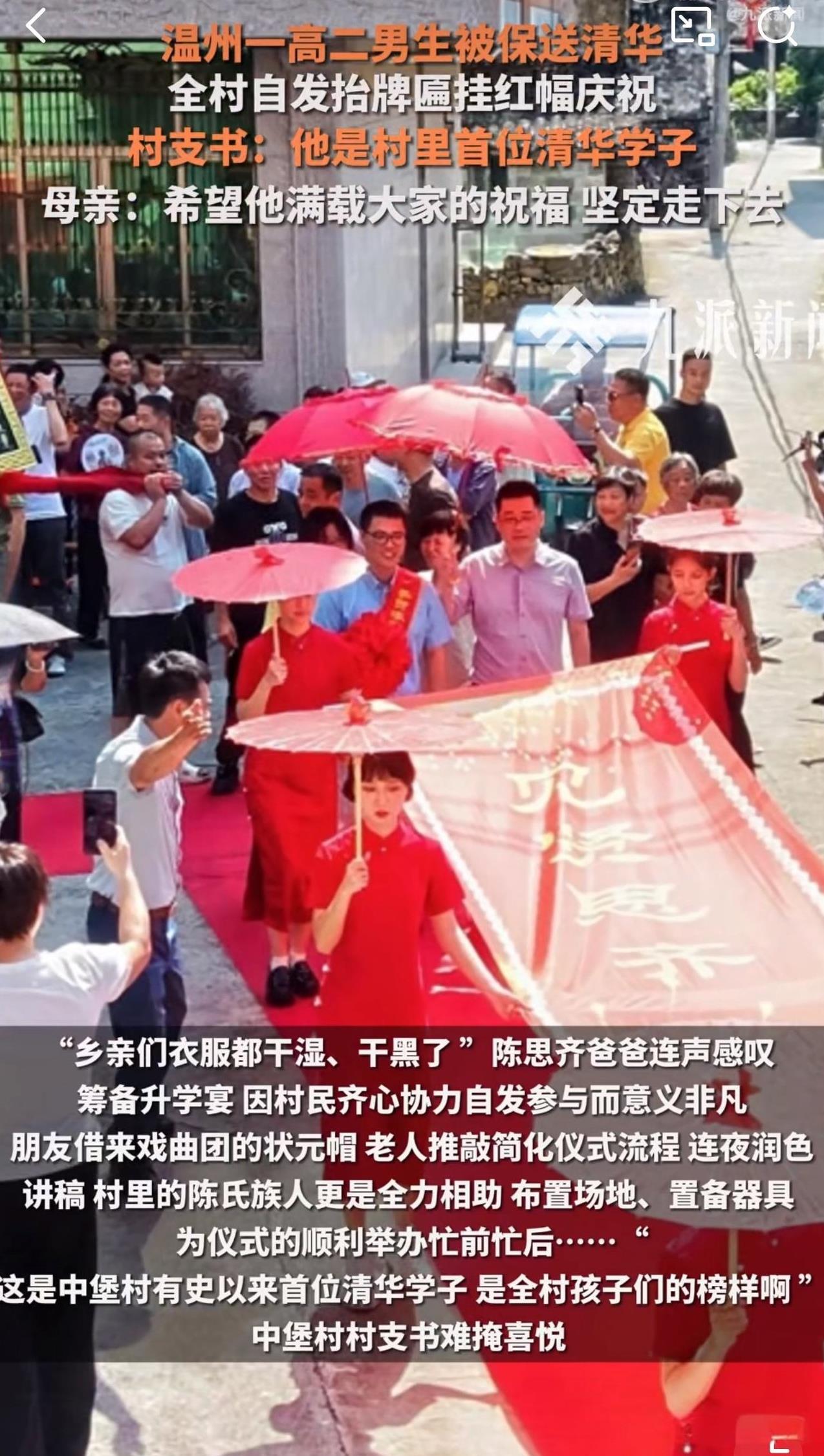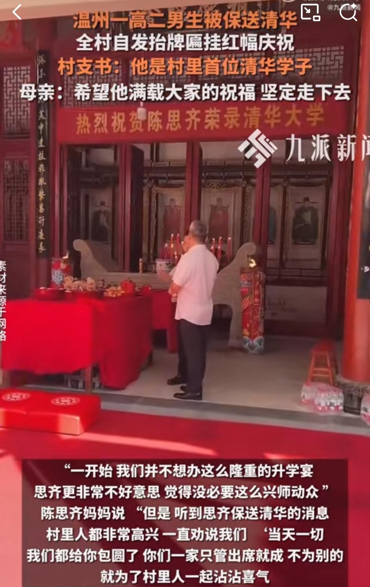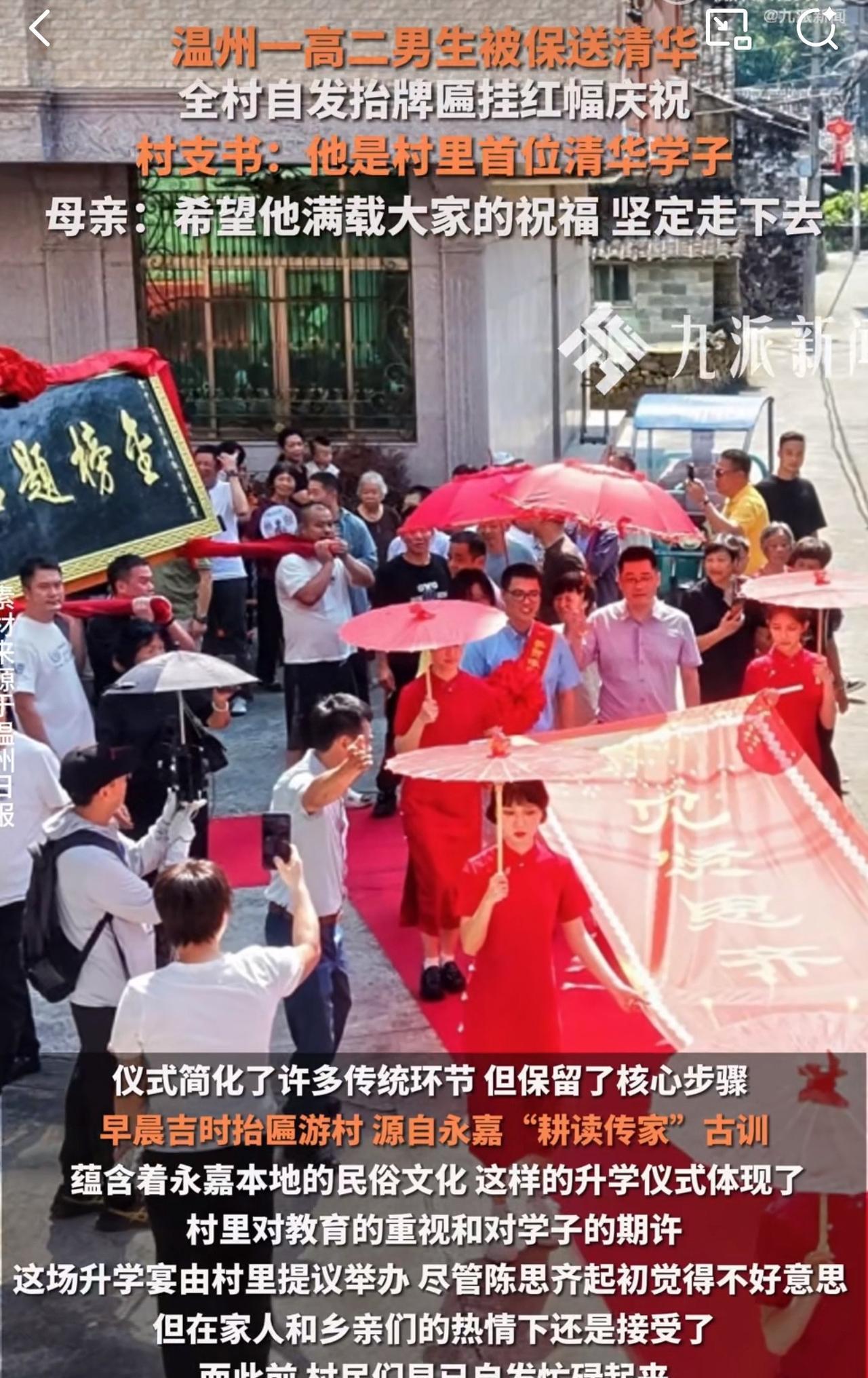 “真牛!高二就保送清华大学!”近日,浙江温州永嘉县中堡村为高二学子陈思齐举办了热闹的庆祝活动,陈思齐通过“攀登计划”保送清华大学物理学,成为村里首位清华学子,引发热议。 据悉,筹备过程中,村民自发参与,朋友借来状元帽,老人推敲仪式流程、润色讲稿,陈氏族人忙着布置场地、置备器具,筹备了个把星期。 村支书回应称“他是全村孩子的榜样,村民们希望借此沾喜气、树榜样!” 而陈思齐父母则表示,“进入好大学只是新开始,也想借这个机会让天南海北的族人团聚,分享喜悦!” 看到这位高二学子陈思齐保送清华,全村庆祝的消息,周少心中满是感动与感慨。 这不仅是陈思齐个人的高光时刻,更是整个村子教育梦想的绽放。在这个快速发展的时代,乡村教育承载着无数家庭的希望,陈思齐的成功,无疑给中堡村注入了一剂强心针,激励着更多孩子勇敢逐梦。 从全村村民的热情筹备中,能真切感受到乡村对知识的尊崇。特别是现在村里年轻人大多在外打拼,能凑这么齐整办件大事不容易。 老人说这是给其他孩子树榜样,确实,当娃娃们看到身边人靠读书走出大山、走进顶尖学府,心里肯定会多份念想,原来好好学真能有大出息。 陈思齐爸妈说得也在理,考上好大学只是开始,没什么了不起的。但村里人借这个由头聚在一起,分享喜悦、唠唠家常,这份乡情比啥都珍贵。现在好多地方过年都凑不齐人,这样的集体庆祝反倒成了难得的团聚机会。 通过这件事,这让我们看到,家庭教育对孩子的深远影响,它教会孩子不骄不躁,始终保持进取之心。其实,一个孩子的成功,是家庭、学校和社会共同努力的结果。 对于这位高二男生保送清华全村自发庆祝,大家怎么看呢?#长沙新朋友# #寻美三湘#