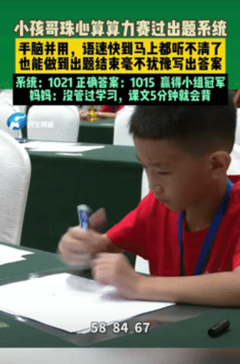 而从视频当中我们也可以看到,在比赛过程中系统读着题,小男孩的手指就在空中拨弄着,就像在拨弄着一个算盘一样。