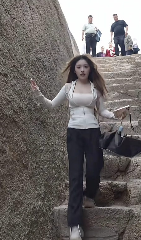 山东泰安,一对情侣去爬泰山,男友建议女友坐索道上山,女友却坚持要自己爬,无奈爬到