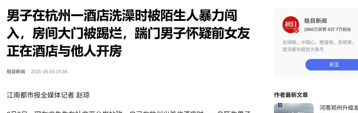 “闹大了!”浙江,一位男子出差杭州住酒店,正在洗澡时突然遭名一陌生男子狂踹房门四五脚后闯入房间,还没来得及穿衣服,对方冲了进来!一问才知道,对方怀疑女朋友与其好友出轨,恰巧男子洗澡正在唱歌,与其好友声音相似!男子虽然理解,但依旧质疑,酒店为何擅自提供房间号? 浙江这边出了档子让人窝火的事,有个男的去杭州出差,住酒店的时候正搁浴室里洗澡呢,突然就听见外面 “砰砰砰” 的巨响,跟打雷似的,他还没反应过来,那房门 “哐当” 一声就被踹开了,一个陌生男的红着眼冲了进来。 这时候他刚洗完澡,身上光溜溜的,吓得赶紧抓过旁边的浴巾裹上,心 “咚咚” 跳得快从嗓子眼里蹦出来,闯进来说的第一句话就挺吓人:“我女朋友呢?让她出来!” 他当时就懵了,自己是来出差的,跟同事住一个家庭套房,满屋子都是大老爷们,哪来的什么女朋友?再看那男的,一脸怒气眼睛瞪得溜圆,像是憋着股火没处撒。 等那男的扫了一圈屋子,看见满屋子陌生面孔,尤其是裹着浴巾、一脸懵的他,才突然愣了一下好像瞬间醒过神来,嘴里嘟囔了句 “搞错了”,就慌慌张张地跑了。 门还敞着被踹的地方裂了道大口子,看着特狼狈,他和同事这才缓过劲来,又气又怕,气的是好端端洗澡被人闯进来,连点隐私都没有,怕的是这人看着情绪不对,万一动手怎么办? 后来才弄明白,闯进来的那男的是因为感情的事钻了牛角尖,他怀疑自己女朋友跟一个姓孙的朋友不对劲,还听说这俩人当晚就住这家酒店。 他一晚上没睡着,憋着股劲想来 “抓现行”,可又不知道具体房号,就揣着气在走廊里瞎转,巧就巧在,他洗澡的时候心情放松,哼了几句歌。 那男的本来就急火攻心,听见浴室里传出的歌声,越听越觉得像那个姓孙的朋友,脑子里那根弦 “嘣” 就断了,认定人就在这屋里,当下也不管不顾,对着门 “咚咚咚” 连踹了四五脚,直接就闯了进去。 虽说搞清楚是场误会,他心里那股气却没顺下去,最让他想不通的是,就算那男的再冲动,他一个外人怎么能大半夜凌晨四点多,就这么畅通无阻地摸到客房楼层?更关键的是他怎么就认准了自己这间房? 他找到酒店前台一肚子火地问,刚开始工作人员还支支吾吾,说可能是前台搞错了,后来又含糊其辞,说是什么 “特殊情况”。 这话听着就更不对劲了,什么特殊情况,能让酒店把住客的房号随便告诉一个陌生人?这不是明摆着没把住客的安全当回事吗? 他越想越后怕,自己和同事都是大老爷们,真要是个独居的姑娘遇上这事,后果不堪设想,花钱住酒店图的就是个安全私密,结果呢?门能被轻易踹开,房号能随便泄露,这跟没锁门有啥区别? 警察很快就来了,把闯进来的男的和酒店负责人都带去了派出所,那男的也知道自己错了,一个劲道歉说当时是被嫉妒冲昏了头,可道歉归道歉酒店这事儿没那么容易过去。 他跟酒店较上了劲,说必须给个说法,赔偿精神损失,毕竟这事儿搁谁身上都受不了,洗澡洗到一半被人破门而入,想想都觉得膈应,现在双方还在僵持着没谈拢。 (信息来源:极目新闻——男子在杭州一酒店洗澡时被陌生人暴力闯入,房间大门被踢烂,踹门男子怀疑前女友正在酒店与他人开房)