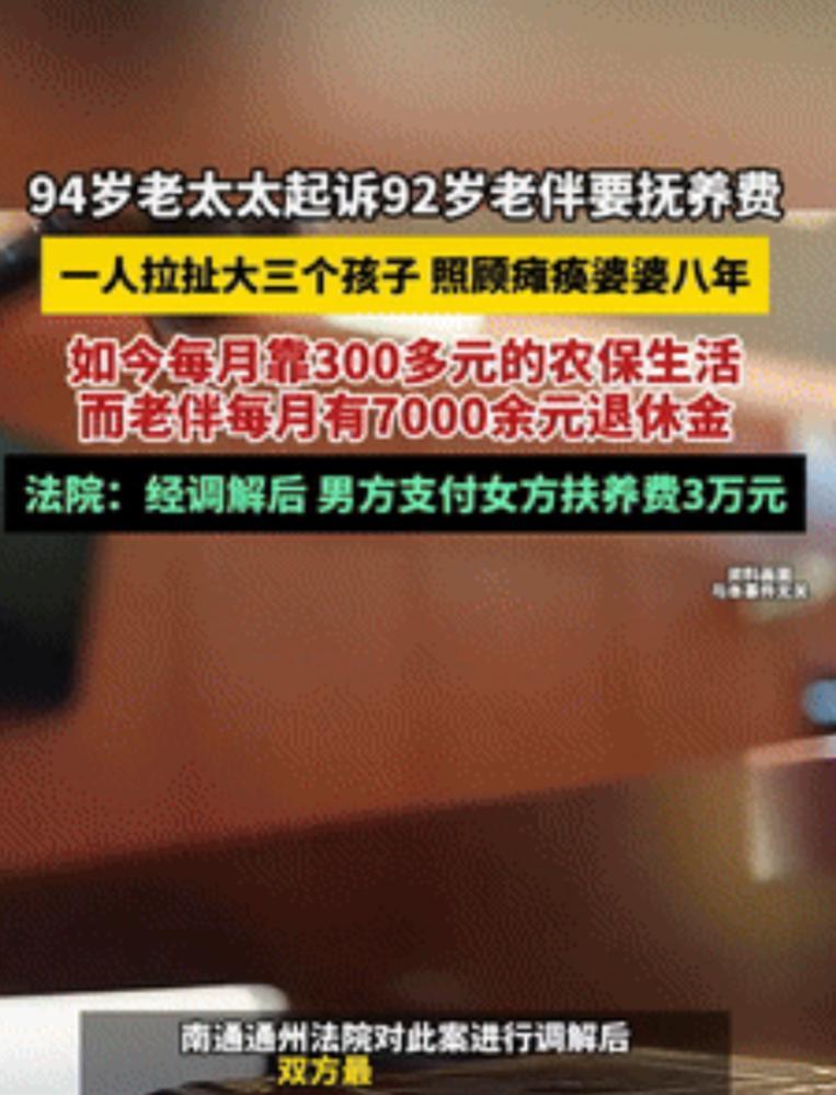 太寒心了!江苏南通,一9旬老太独自拉扯大3个孩子,还照顾过瘫痪婆婆八年,如今因疾病生活无法自理,仅靠每月3百多低保生活,可老伴明明每月有7千多的退休金,却对她不管不顾,无奈之下,她只好将老伴告上法庭,索要抚养费! 江苏南通这事儿,听着就让人心里堵得慌,一对过了快七十年的老夫妻,临了临了居然闹到了法庭上,90 多岁的曹奶奶,现在走路都打晃,浑身是病连端杯水都费劲。 可她那个 92 岁的老伴张爷爷,每月拿着七千多的退休金,却对她不管不顾,最后没办法,曹奶奶只能把相伴一生的人告上法庭,就为了要点扶养费。 说起来曹奶奶这一辈子,真是为这个家熬干了心血,年轻时候张爷爷在外头上班,家里的事儿全落在她一个人肩上。 三个孩子从嗷嗷待哺到长大成人,全是她一手拉扯大的,那时候条件苦白天下地挣工分,晚上哄完孩子还得缝缝补补,常常忙到后半夜。 更不容易的是张爷爷的妈后来瘫在了床上,吃喝拉撒全得人伺候,这活儿又是曹奶奶接了过来,整整八年她每天给婆婆擦身、喂饭、端屎端尿,从没抱怨过一句。 街坊邻居都说,要不是曹奶奶细心照料,老太太未必能熬那么久,可那时候的人不讲究这些,觉得女人在家操持就是本分,没人给她算过 “工钱”,更没人想过,这些操劳会让她老了落下一身病。 现在老了报应似的,曹奶奶的身体垮了,心脏病、癫痫跟着来,一天三顿药不断,手脚也不利索,生活根本不能自理,她没工作过,一辈子围着家里转,现在就靠每月三百多的农村低保过活,这点钱连买药都不够,更别说请人照顾了。 子女们看着心疼,轮流来搭把手,可他们也有自己的家要养,请个护工,一个月就得几千块,加上药费,日子过得紧巴巴,时间长了实在扛不住,他们劝过张爷爷,让他多少帮衬点,毕竟是过了一辈子的夫妻。 可张爷爷那边,日子过得宽裕多了,他退休前是正式职工,现在每月退休金七千多,是曹奶奶低保的二十多倍。 虽说他自己也九十多了,有高血压每天也得吃药,身边也请了护工,但手里有底气啊,可面对曹奶奶的难处,他就是不松口,要么说自己钱不够用,要么干脆避而不见。 这事儿拖了些日子,曹奶奶的身体越来越差,子女们也实在没辙了,看着自己掏心掏肺过了一辈子的人,如今能眼睁睁看着自己受苦,曹奶奶心里那滋味,估计比身上的病还难受。 最后咬咬牙,她让子女帮着写了诉状,把张爷爷告到了法院,就想要点扶养费,能让自己体面点活下去。 法庭上俩老人都颤巍巍的,曹奶奶坐在原告席上,话都说不太利索,可说起过去的日子,眼里还是红了,张爷爷坐在对面,头发全白了低着头,没怎么说话就是一脸无奈。 法官也知道这事儿难办,没直接判先调解,他跟张爷爷说,《民法典》里写得明明白白,夫妻有相互扶养的义务,这跟过了多少年、感情好不好没关系,年轻时候她为家里付出那么多,现在她难了,你手里有条件该帮一把。 最后张爷爷同意一次性给曹奶奶三万块钱,钱不算多可能也就够请几个月护工,买点药,但这事儿总算有了个结果。 可想想还是让人难受,一辈子啊,她为他带大孩子,伺候老人,把自己熬成了药罐子,他拿着退休金,却在她最需要的时候转了身,这哪是钱的事儿是寒了心啊。 街坊们说起这事儿都叹气,说这老两口,年轻时没红过脸,到老了却因为这点钱对簿公堂,说到底,还是过去那种 “男主外女主内” 的日子埋下的坑,她的付出没变成养老钱,他的退休金成了自己的保障,临了,情分就这么被现实磨没了。 (信息来源:现代快报——94岁老太太起诉92岁老伴:给我扶养费)