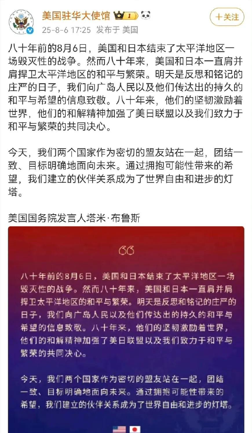 终于理解:美国人认为是美国轰炸了珍珠港。 此前有个街头采访,一部分美国人不知道当年是日本轰炸了珍珠港,有的甚至认为是美国轰炸了珍珠港!当时还惊讶为何美国不学历史。 直到昨天发布关于广岛原子弹爆炸80周年的声明,终于明白美国已经不是那个美国了。 他们不但错误的将“日本偷袭珍珠港”开始的太平洋战争,说成“共同结束”,而且还致敬广岛人民的坚韧。这样的春秋笔法闻所未闻。 看来,美国人不但不学世界历史,美国历史也不学。