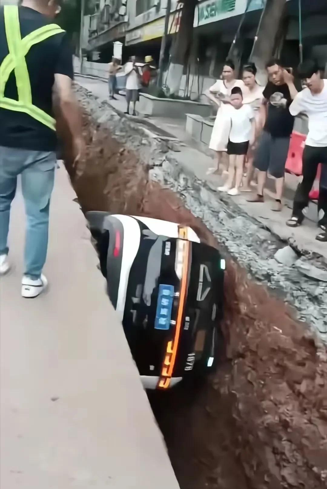 无人驾驶掉沟里了!原因竟然是因为在修路!车上还有一名女子,幸好人没大碍,被众人救