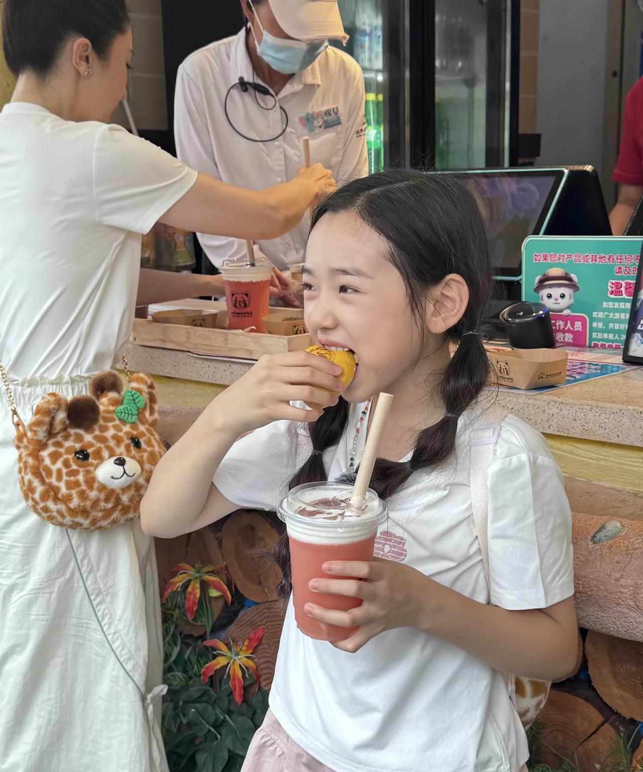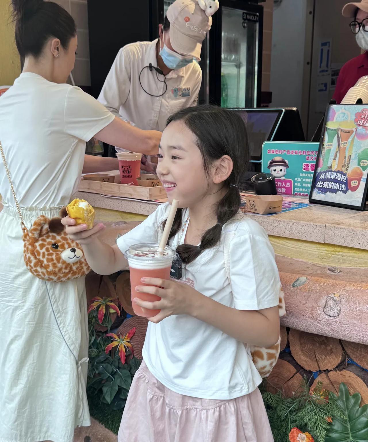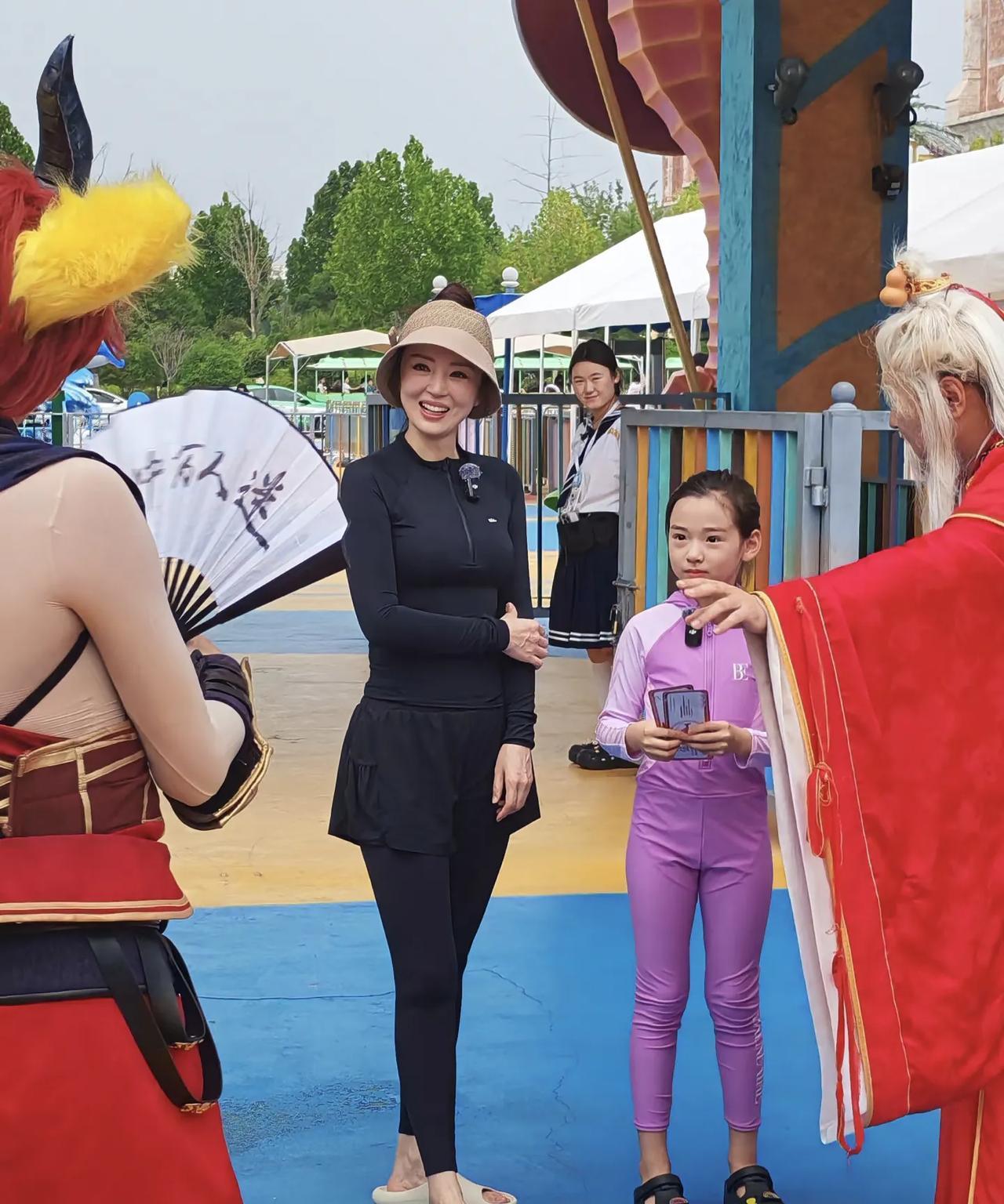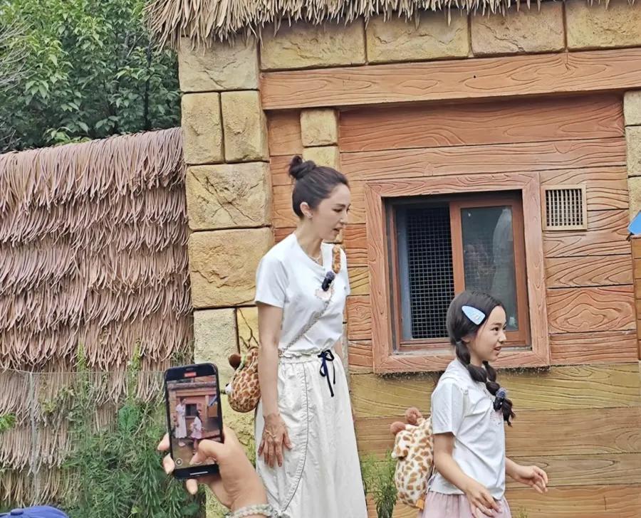 董璇和女儿小酒窝在郑州银基动物王国游玩,她们穿着母女装,脸型五官长得非常像。小酒