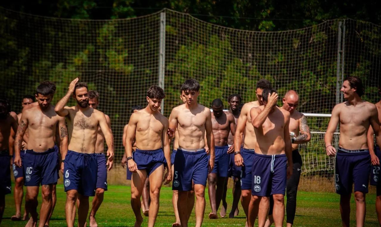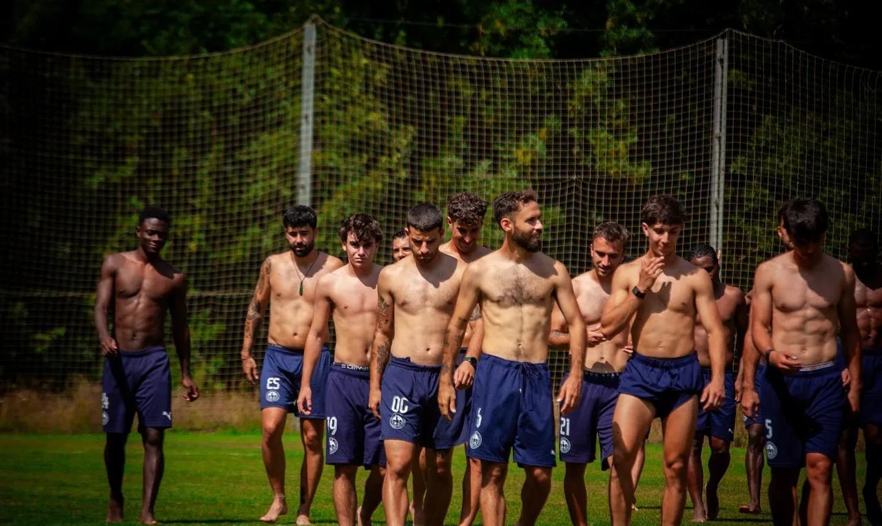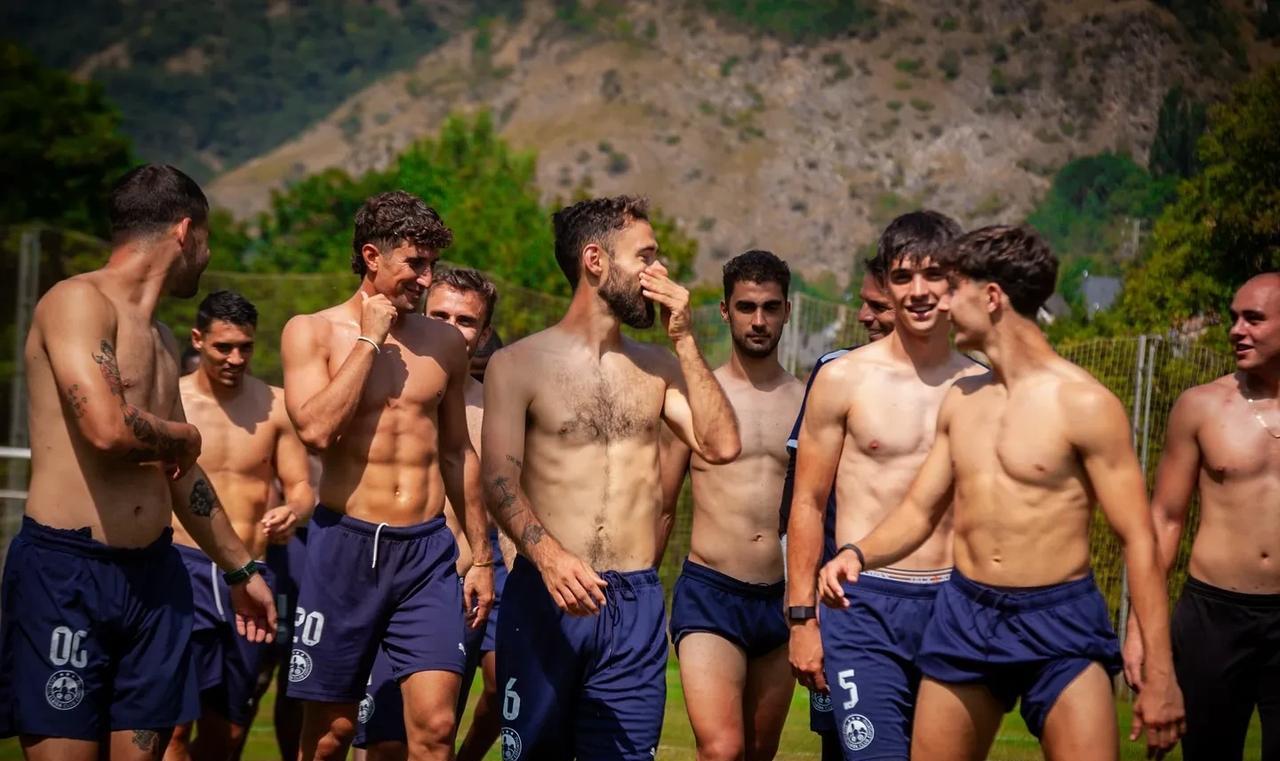 西班牙莱里达竞技官方社媒发布了球队的最新照片,我有球员都赤裸上身光脚走在球场上,