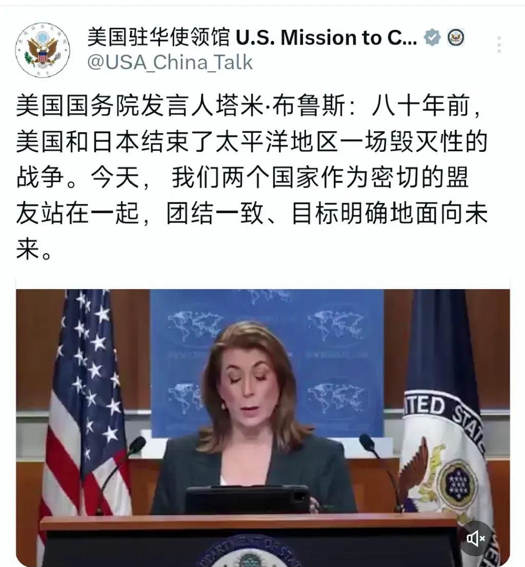 某使馆是不是有点人格分裂了? 某使馆得有多分裂的人格,才能这样子表达。 美国驻华使领馆今晚(8月6日晚)写道:“美国国务院发言人塔米·布鲁斯:八十年前,美国和日本结束了太平洋地区一场毁灭性的战争。今天, 我们两个国家作为密切的盟友站在一起,团结一致、目标明确地面向未来。” 罔顾事实,只按照需要和自身利益叙事。 珍珠港不提了,竟然成了肩并肩的好朋友。居然赞美广岛人民的坚韧,多么的讽刺,多么的没有底线啊。 虚伪的表面功夫,让这群人玩到天花板了。 这些话,公知,殖人,买办等看到后又兴奋了。甚至会大声呼喊:peace and love.