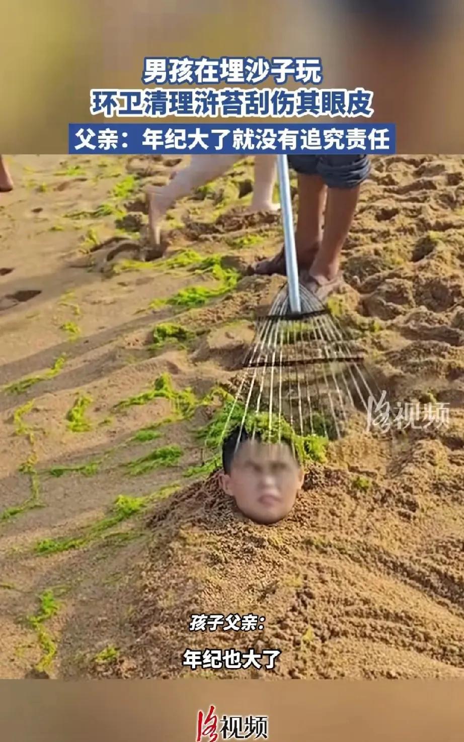 近日,一个孩子在海边玩埋沙子时,被环卫工用钉耙划伤眼皮,此事引发了热议。 当时,孩子整个身子都埋进了沙子里,仅露出一个头,头上还覆盖着苔藓。环卫工清理苔藓时没看到孩子,耙子从孩子脸上划过去,伤到了孩子的眼皮。 孩子的父亲表示不追究环卫工的责任,因为环卫工年龄比较大了。 然而,有眼尖的网友指出,你在拍视频,孩子只露出个头还被苔藓盖住,环卫工没看见也在情理之中。环卫工第一次用钉耙划到孩子脑袋时,你没有阻拦,第二次划过时,你仍然没有阻拦,这是你监护不到位的责任。 幸好只是伤到眼皮,没划伤眼睛,不然你还不得漫天要价,这不是明显的碰瓷吗? 有些家长不从自身找原因,却总是责怪他人,这世间如此奇葩的人还真不少呢。