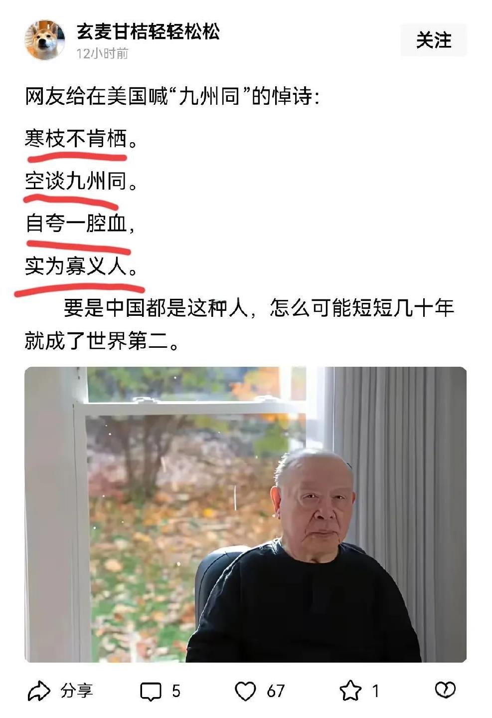 网上有个梗叫“49年入国民党”。指某些人在新中国成立前夜站错了队。许倬云就是这样的人。我们的老读者果然又发文吹捧许倬云。它不发文才奇怪。为什么国内一帮公认的公知和在为当公知努力奋斗的人都吹捧跪拜许倬云?因为他是身在美国的公知们的精神偶像,是他们的祖宗,教师爷。几乎所有的公知都梦想脱离中国,移民美国并在学术上有所成就,许倬云身残志坚却做到了,活成了他们梦想的样子。 网友给这位许倬云赋诗一首: 寒枝不肯栖, 空谈九州同。 自夸一腔血, 实为寡义人。 更何况,他心中的“但悲不见九州同”,悲的是反攻大陆成为泡影。 看看还有哪个公知没有磕一个?