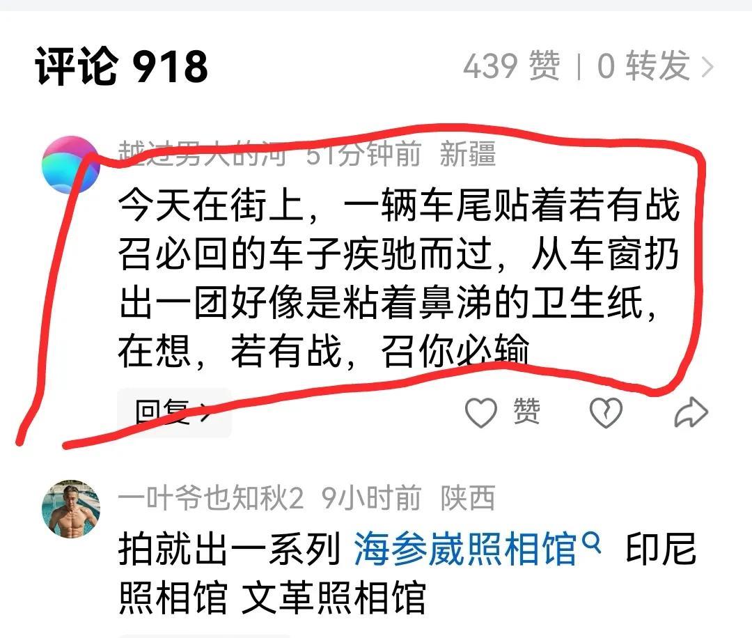 某网友留言写道:“今天在街上,一辆车尾贴着‘若有战,召必回’的车子疾驰而过,从车