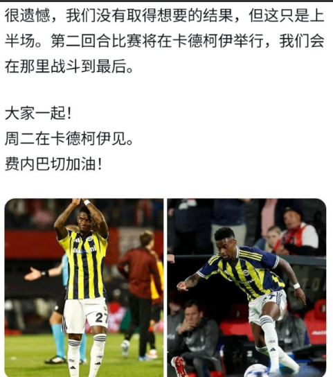 穆里尼奥零转会费摇来的葡萄牙国脚塞梅多,迎来费内巴切的首秀,第58分钟替补登场,在右翼卫位置上,很好的稳住了局面。球队虽然输掉了首回合欧冠资格赛,但英超老油条塞梅多信心满满,表示下回合一定在主场,击败荷兰飞燕费耶诺德。
