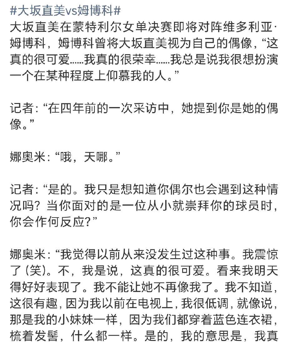 真没想到,蒙特利尔1000赛竟然是大阪直美和姆博科走到了决赛! 4年前,才14岁