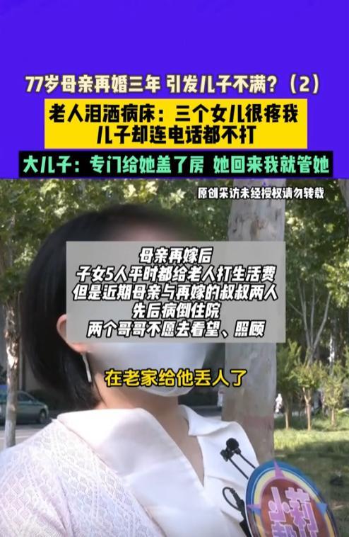 “孝子不养下堂母?”河南驻马店,一77岁老太,背着2儿3女,偷偷再婚,第二任老伴突发脑梗,老太也胃出血生活不能自理,儿子却拒绝赡养,还怒斥母亲:你一把年纪还嫁人,我都跟着丢人现眼,你再婚了,就让老头养你,我就不给你养老,你去告,判我坐牢我就坐。儿子接着说出母亲改嫁的秘密,惊呆了众人。 根据河南广播电视台民生频道8月5日的报道,河南驻马店新蔡县发生了一件令人唏嘘不已的家庭纠纷,一位77岁的老太太,其生活遭遇让不少人感到揪心。 这位老人的前半生并不轻松,在丈夫50多岁时,他突发脑梗,落下偏瘫且不省人事的结果,此后长达8年的时间里,老太太尽心尽力地照顾着丈夫,不离不弃。 可命运弄人,丈夫最终还是离开了人世,留下老太太独自生活,那时的老太太60多岁,儿女们有的外出务工,有的远嫁他乡,她开始了独居生活。 时间来到三年前,经人介绍,老太太结识了一位男士,二人情投意合,便走到了一起,或许是出于对子女想法的顾虑,老太太背着2儿3女,偷偷与男士再婚。 这三年间,老太太脸上时常挂着笑容,整个人看起来自由又放松,她享受着这段黄昏恋带来的温暖。 天有不测风云,今年年初,老太太的老伴突发脑出血,身体状况急转直下,而祸不单行,老太太自己也突发胃出血,生活一下子不能自理。 此时,本该是子女们承担起赡养照顾责任的时候,可情况却不尽如人意,老太太有3个女儿,她们得知母亲生病后,心急如焚。 虽说都已远嫁,但她们放下手头的事情,纷纷赶回轮流照顾母亲,在病床前,女儿们端汤喂药,无微不至地关心着母亲。 反观两个儿子,二儿子常年在外务工,面对小莉帮忙的电话联系,选择不接听,大儿子的态度更是令人心寒,当小莉帮忙前往他家询问时,他直言母亲和别人再婚且领了结婚证,还住到别人家,自己暂时没有养老义务了。 他觉得自己出门做生意,母亲这样的行为让他在外面抬不起头,丢了面子,大儿子还说出了心里的委屈,原来这些年他每年都会给母亲打钱,还为母亲安了空调,甚至花了几万块钱盖房子,可母亲没住一年就嫁人了,这让他觉得自己的付出都白费了。 在他看来,母亲嫁人并非只是孤单没人照顾这么简单,既然母亲已经再嫁,那就应该由男方家赡养。 此事件经媒体报道后,迅速引发网友热议,有的网友指责大儿子的行为,认为赡养父母是子女应尽的义务,怎么能因为母亲再婚就不管不顾了呢,这是违背道德伦理的。 也有网友表示理解大儿子心里的不平衡,但即便如此,也不能在母亲生病时对其不管不问。 还有网友提到,老人再婚找个伴儿相互照顾,本是很正常的事,子女应该尊重老人的选择。 在我们的社会中,赡养父母是中华民族的传统美德,也是法律规定的义务,无论父母的婚姻状况如何改变,这种基于血缘关系的赡养责任都不应被抛弃。 这位77岁老太,辛苦半生,晚年本应享受天伦之乐,却因再婚遭遇儿子的嫌弃与不管不顾,着实令人痛心。 希望在相关调解下,儿子能放下心中的芥蒂,承担起赡养母亲的责任,也希望此类事件能引起更多人对老年人婚姻及赡养问题的关注。 大家对此事有什么看法呢,欢迎留言评论。