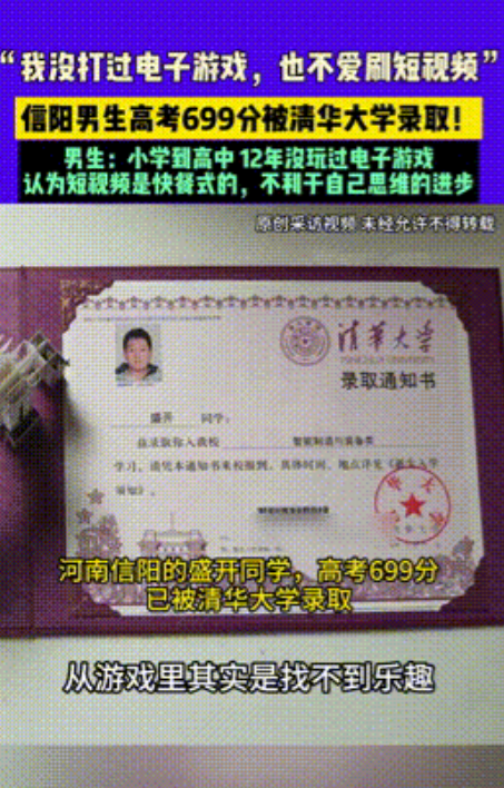 怪不得能上清华!”近日报道,河南信阳,一男生高考成绩699分,最终被清华录取,当记者上门采访时,没想到男生竟表示:“从小学到高中,12年都没玩过电子游戏,也不爱刷短视频”!随后她的一句话,更是让人感到佩服!网友:这不是学霸都难! 在如今这个手机不离手、短视频刷不停的时代,信阳考生盛开这样的习惯显得格外“另类”。更让人意外的是,他不是硬逼着自己不玩,而是真的对游戏没兴趣。他说:“在游戏里找不到乐趣,反而从新闻、科学实验里能获得快乐。” 这话一出,有人佩服他的自律,也有人好奇:“他是怎么做到的?” 原来,他并不是在“咬牙坚持”不玩游戏,而是自然而然地对游戏无感。他更喜欢看新闻、研究科学实验,觉得短视频太碎片化,对思维提升没帮助。这种状态,用老一辈的话说,叫“坐得住”。反观现在的孩子,从小都被各种电子设备包围,能静下心来看书、思考的越来越少。 而且,据他的父母所说,家里没有刻意禁止他玩手机,但他从小就喜欢翻书、问问题。小学时,别的孩子抱着iPad看动画片,他却对《十万个为什么》和科普纪录片更感兴趣。可见,这种习惯不是靠家长逼出来的,而是他找到了比游戏更有意思的事。 男生对短视频的态度也很有意思。他说短视频是“快餐式”的,看多了对思维没好处。这话说得很实在,刷短视频时,大脑一直被新鲜刺激轰炸,看似在“获取信息”,其实只是被动接受零碎内容,很难形成深度思考。 相比之下,他更喜欢看新闻、读科学杂志,甚至自己动手做实验。这些事虽然没那么“爽”,但能带来更持久的满足感。就像吃惯了重口味外卖的人,突然尝到一碗清炖鸡汤,反而觉得更舒服。 其实,争论“该不该玩游戏”没意义。关键在于,这个男生找到了适合自己的节奏。就像有些人觉得打游戏很放松,有些人喜欢看书解压,虽然方式不同,但都是在寻找让自己舒服的状态。 只不过,在如今这个信息爆炸的时代,能不被短视频和游戏“绑架”、保持独立思考的人,确实越来越少。 这个清华男孩的经历,倒不是说“不玩游戏才能成功”,而是提醒我们:真正的自律,不是硬逼自己,而是找到更喜欢的事。就像如果你觉得学习痛苦,硬撑很难长久。但如果你发现解题的乐趣、阅读的沉浸感,那“自律”就变成了自然而然的事。 短视频和游戏虽然不是洪水猛兽,但要知道适可而止。因为,能坐得住、能深度思考的人,在未来会越来越稀缺。 说到底,这个男孩的成功,不是因为“不玩游戏”,而是因为他早早找到了更高级的快乐。 信息来源: 河南广播电视台民生频道——8月2日(采访)河南信阳,“我没打过电子游戏,也不爱刷短视频”信阳男生高考699分被清华大学录取!男生:小学到高中12年没玩过电子游戏,认为短视频是快餐式的,不利于自己思维的进步