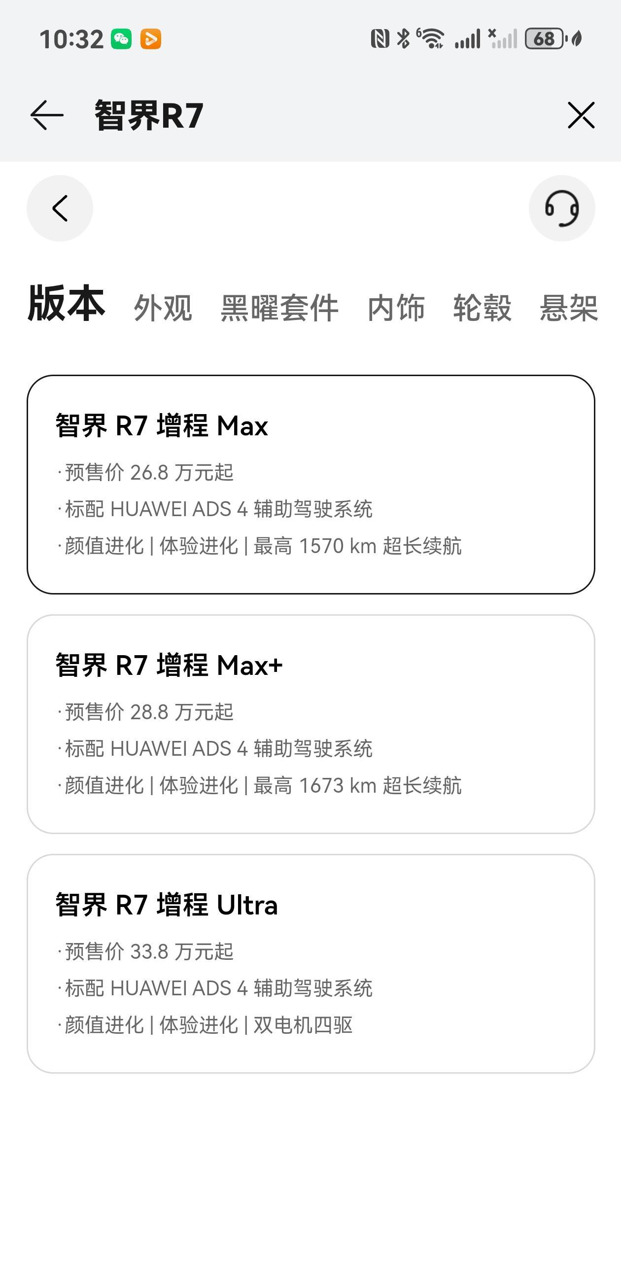 这回油电同价,去掉Pro,标配辅助驾驶,智界双7开启预定 R7预售价26.8万元起 智界R7预售价25.8万元起 2000订金抵5000元 R7划重点:增程,纯电预售价相同,MAX+版本可选空悬 我们的选购建议:MAX版就挺好,辅助驾驶比零重力和空悬含金量更高,驾控和续航也都没问题【来自懂车帝车友圈】