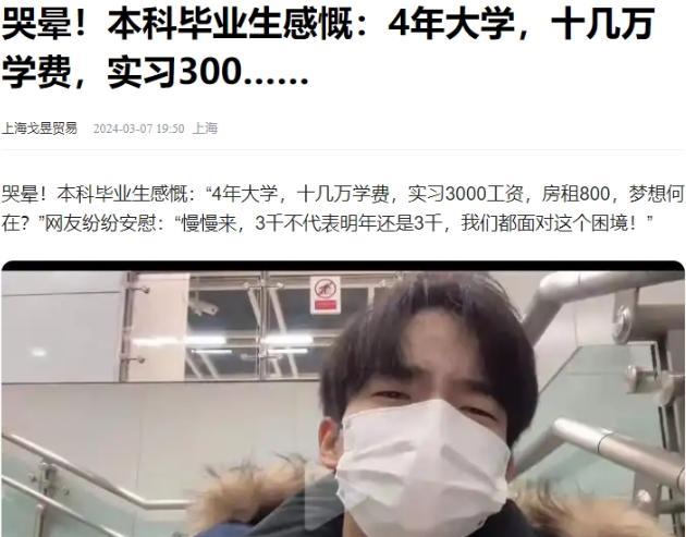 这是社会给你们上的第一课!大学生哭诉:“读了4年大学,学费花了十多万,出来实习3000工资,我交房租就要800元,你告诉我什么是梦想?”网友:慢慢来,今年3千,不等于明年也是3千,先站住脚,不是你一个人是这个现状! 说白了,大学生们如今不过是流水线上产出的一个个“商品”,他们被高额学费推着走,然而在社会的竞争中,他们不过是沉默的参与者。 大学教育这几年,看似给了年轻人更多的知识和技能,却也让他们背负上了沉重的经济负担,你看花了四年时间、上了四年的大学,最终出来的却只是个实习生,月薪三千,交房租都要八百,这样的现实简直让人心酸。 大家常说,“读书改变命运”,但在如今这个就业市场的环境下,大学生们无非是被大环境裹挟的局外人,什么梦想、理想,恐怕都是空谈。 对于不少人来说,大学生的身份早已不再代表什么特别的地位,美其名曰大学生,他们的能力却远远不足以与社会的需求对接,和几十年前的高中生相比,今天的大学生除了在手机上游刃有余地打游戏,似乎再也没有什么拿得出手的本领。 每年三万块的消费,意味着每一个大学生都成了学校的“提款机”,一千多万的大学生,就是每年小5000亿的市场支出,这成就了教师们高收入的同时,也滋养了学校周边的餐饮、住宿行业,可是最终受苦的还是那些普通的打工人。 如果你没有什么过硬的技能,没有为老板创造更多财富的能力,那么你即便从大学毕业,进入社会,也只能面对三千五千的工资,几年下来恐怕工资再难有所突破。 你以为这是一份稳定的工作吗?其实资本家看中的,永远是你能够为他们创造的剩余价值,而你却只能做一个辛勤的劳动力,劳累一生却始终在原地踏步。 “你要明白,别人的梦想不是你的命运。”这句话是许多年轻人走向社会后慢慢体会到的真理,许多大学生都希望在工作中实现自我价值,可是越来越多的大学生发现,现实不是他们曾经在校园里幻想的那样。 工资三千块这样的数字真的让你感到心寒,你不能指望靠一份实习工资就能在城市里过得好,虽然每个人的境遇不同,但总体上大学生们普遍面临着“钱多事少离家近”的工作机会几乎不存在的局面。 正如有网友所说:“先站住脚,慢慢来,三千块钱,不代表明年还是三千块。”这是大学生们逐渐学会的一课:在现实面前,梦想得慢慢追求,而不是一蹴而就。 对于大多数人来说,面对日益严峻的就业形势,他们不得不把“梦想”从心中拿出来,变得务实一些,看看眼前的挑战,而不是停留在理想的泡沫中。 社会的现状,也许并没有为大学生们铺设一条光明大道,但从另一个角度看,大学的作用也许并不仅仅是让你获得一个高薪的工作,它或许更应该教会你如何在职场上生存,如何在竞争中找到自己的一席之地。