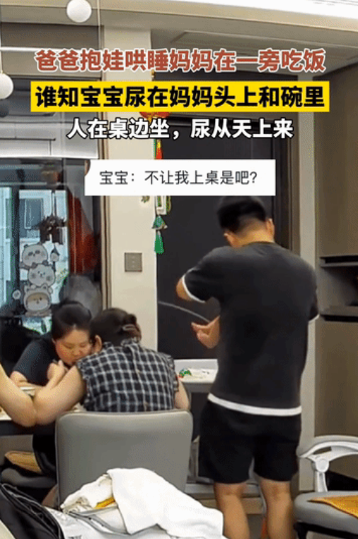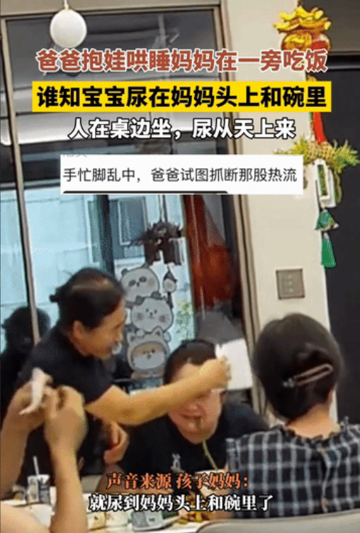 “尿太准了!” 陕西西安,妈妈正扒着饭,爸爸正在哄娃,冷不丁头顶一凉,宝宝尿尿了,尿液顺着妈妈的头发滴进碗里,抬头又看见爸爸手忙脚乱捂向宝宝,妈妈直接出现了“痛苦面具”全家人都还笑着合不拢嘴,网友“人为桌边坐,尿从天上来” 妈妈说“当时全家正在吃饭,孩子突然哭闹起来,”爸爸就放下手中的碗筷,及时去抱起宝宝,妈妈琢磨着“赶紧扒拉两口饭去换换手”爸爸抱的胳膊都是酸了。