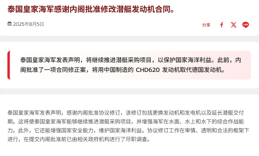 泰柬边境冲突刚落幕,泰国便火速通过搁置4年的中国S26T型潜艇军购案!佩通坦内阁批准:同意采用中国自主研发的CHD620柴油机。