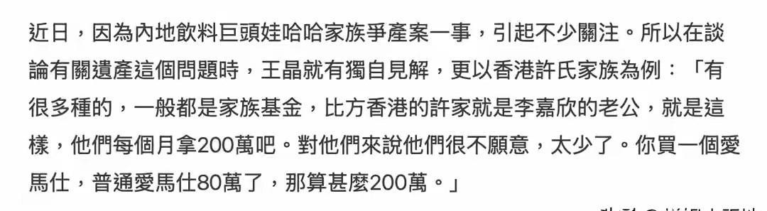 王晶揭开李嘉欣在豪门的遮羞布! 以为加入了豪门让人羡慕,没想到败家子的作风让她家公早早就看穿,在去世前都要提防家产用不到世世代代。然后就想到了信托这个方法,把400亿放信托,每个月每人可以拿200万利息花,本金一直不变不能动,这样许家至少好几代都不会穷。 但是王晶却借宗馥莉争遗产事件揭开了李嘉欣的遮羞布,认为李嘉欣是富豪堆里的穷人,200万一个月根本不够她花,随便买一个爱马仕的包她都消费不起。难怪每次看李嘉欣出席马会,穿的都是过季的衣服。相比其他豪门富不过三代,许世勋的做法其实是可以理解,只是在李嘉欣这里,她成了笑话#头号创作者激励计划#