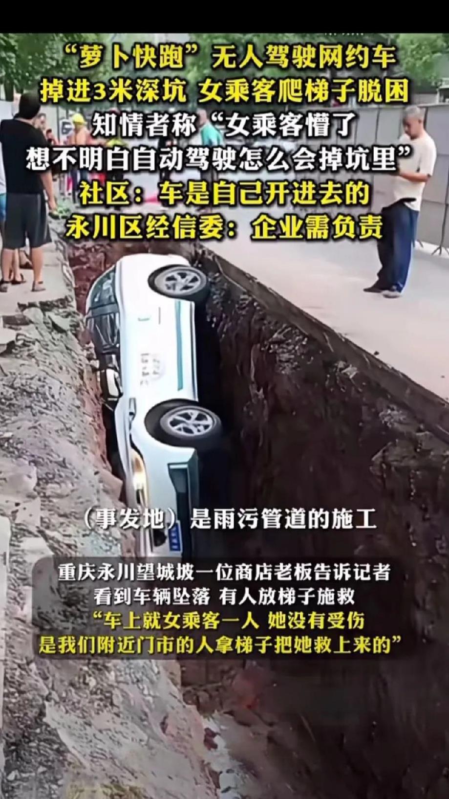 原来一直以为无人驾驶汽车我非常安全的没想到也会出事。 近日,在重庆市永川区,一辆萝卜快跑在行驶途中居然一头栽进了坑里,把打车的女子吓得惊魂难定,最后在附近居民的协助下,放下梯子后才慌乱地自己从坑里爬了出来。 这辆萝卜快跑是在永川区工作时掉进坑里的,其平台和社区工作人员都已经证实了此事,永川区经信委认为萝卜快跑公司必须对此负责。 看来萝卜快跑也并非无所不能,机器人也更会犯错,不知是设计存在缺陷还是电脑中毒了呢? #头号创作者激励计划#