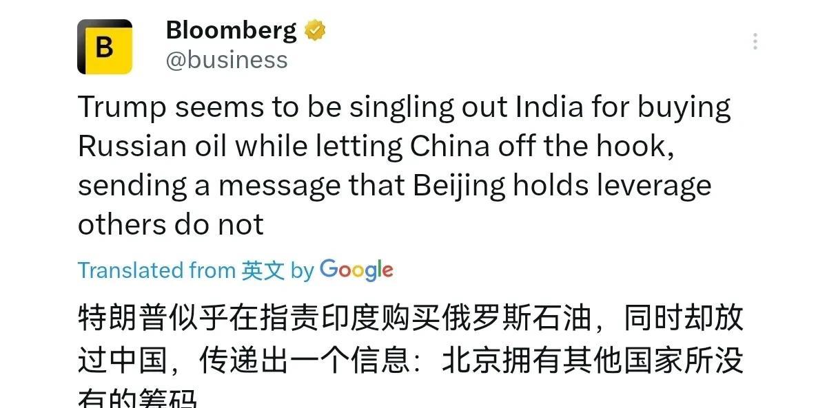 美媒出来说实话了!印度估计要气的跳脚!美媒坦言,美国对中印搞的就是区别对待。8月8日,美国彭博社刊文表示,在购买俄罗斯能源问题上,印度挨重锤,美国对中国却只警告,不下手。美国这明显就是对中印两国实行了不同的标准。有国外博主就表示,这本质上彰显的就是中国和印度,在美国心目中明显是两个不同级别的国家。 美国这是用实际行动给中印两国的国力对比作了背书,让印度感到难堪的事实是,它们不仅要被美国收重税,而且这会刺破印度的自尊心,尽管印度心里面认为印度和中国是平起平坐的国家。不得不说,美媒说的确实是事实。国与国的实力对比,不是虚的,不管平时如何吹嘘,在事上面就会见真章。 美国对印度出手,不是美国不想对我们出手,而是美国已经跟我们交过手,中国是什么分量,美国自己心里面当然是清楚的。并且,在美国对印度出手之后,印度明显很软。印度甚至都没有采取任何对等反制的动作,哪怕形式上的对等反制动作都没有。很显然,美国的区别对待,这是检验了中印两国实力的成色。当然,我们从未与印度相比较,而至于印度,估计会因此跳脚。 #头号创作者激励计划#