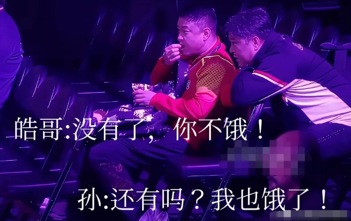 王楚钦对阵陈垣宇,德比之战场外休息,看台上王皓指导抱着一个包包,正在里面找点可以垫吧一下肚子的零食,孙逊教练看着皓哥吃,有没有也感觉饿了。
