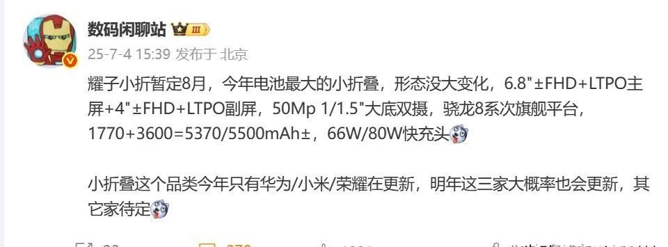 2025年小折叠赛道仅剩两三家,荣耀MaigcVFlip2爆料8月发布,将搭