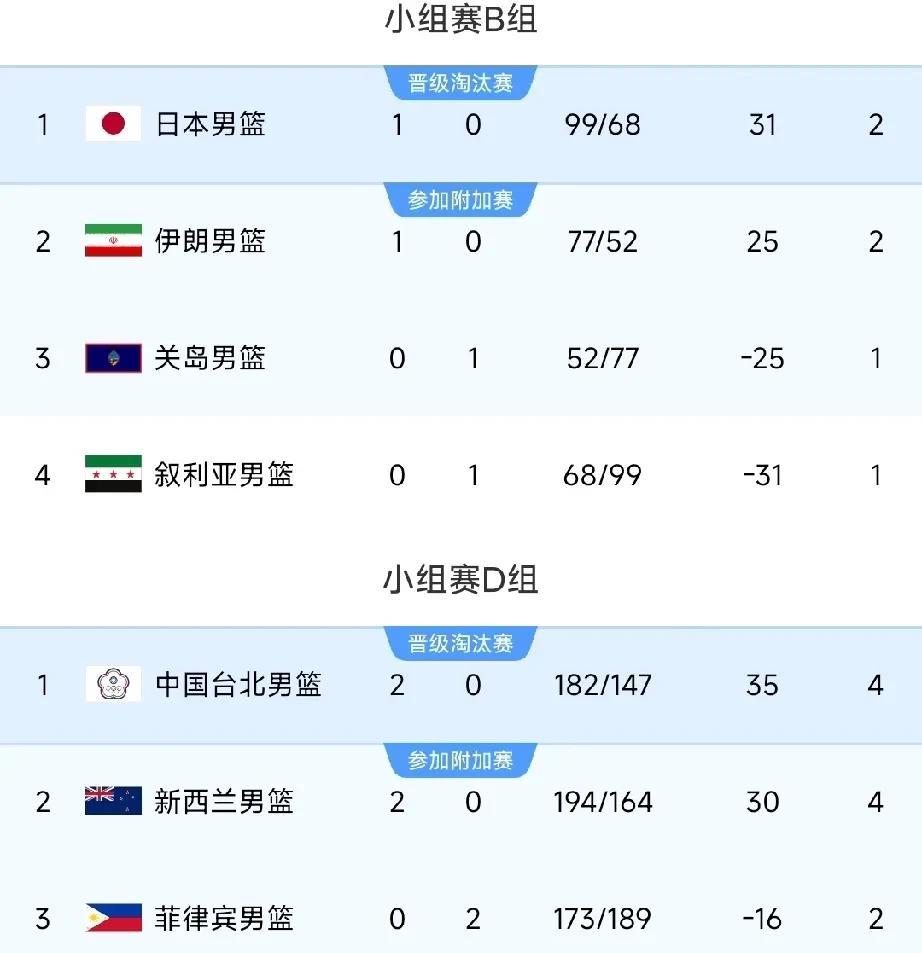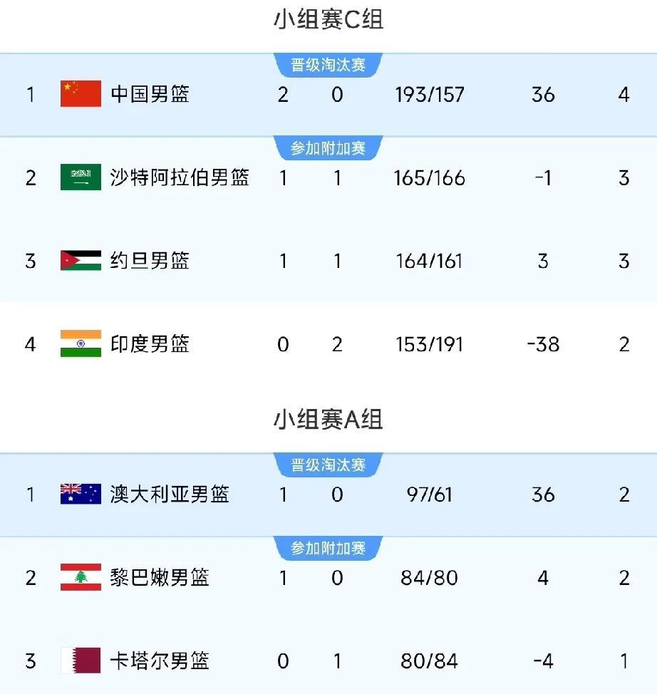 亚洲杯男篮积分情况,中国男篮小组第一! 目前亚洲杯中国男篮已经取得了2连胜,目前中国男篮所在的C小组净胜分36,积分4分,小组第一。 其他组积分情况,A组第一为澳大利亚,B组第一为日本男篮,D组第一为中国台北! 根据规则,每个小组第一直接晋级8强淘汰赛,小组第二三名则需要参加附加赛,来争夺最后四个淘汰赛名额!中国男篮肯定会直接进入8强的!