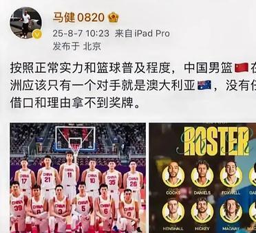 昨天,前中国男篮名宿马健在社媒上发文:“按照正常实力和篮球普及程度,中国男篮在亚洲只有一个对手就是澳大利亚,没有任何借口和理由拿不到奖牌。”