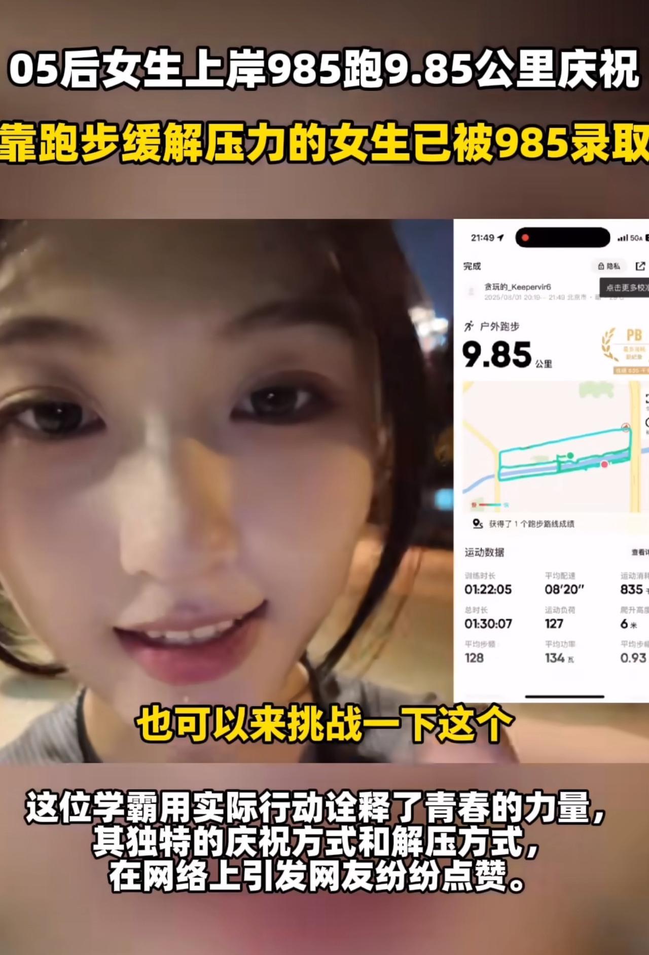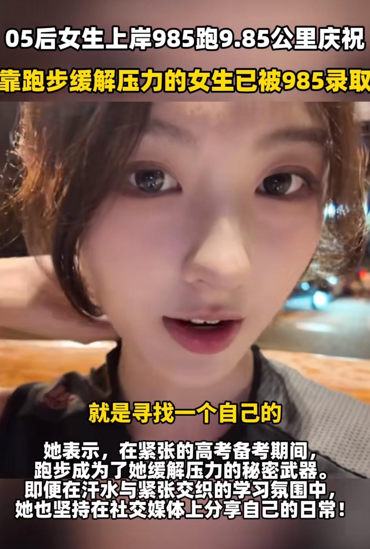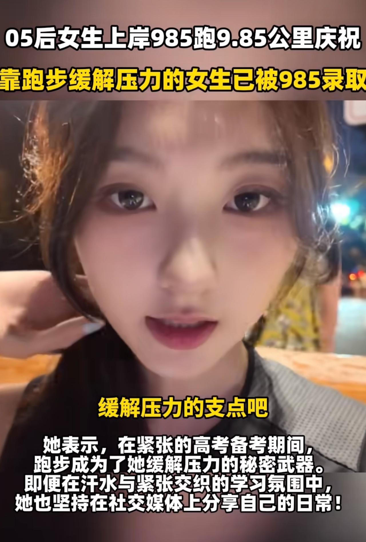 #MCN双量进阶计划#“这庆祝方式确实特别!”近期,高考录取通知书发放时,一位北京00后女生的庆祝方式引发关注。她收到985院校录取通知书后,以跑9.85公里的特别方式庆祝,引热议。 该女生透露:“高考备考的紧张阶段,跑步是她缓解压力的“秘密武器”。即便备考艰苦,她仍坚持跑步,不仅帮助释放压力,还磨炼了毅力与自律精神,让学习与生活得以平衡。大家如果有精力的话,可以来挑战一下这个9.85公里!” 看完北京这位00后姑娘的庆祝方式,周少觉得还挺有意思的,跑9.85公里对应考上的985大学,既应景又有意义,确实特别。 说真的,现在学生备考压力都大,能找到适合自己的解压方法很重要。这姑娘用跑步来缓解紧张,不光放松了心情,还锻炼了身体,顺带把毅力和自律也练出来了,学习和生活两头都没耽误,这种方法值得借鉴。 很多人可能觉得备考就该一门心思扑在书本上,其实不然。适当的运动反而能让人脑子更清楚,效率更高。这姑娘用自己的经历证明了,学习不是死磕到底,找到平衡点更重要。 她还鼓励大家挑战9.85公里,这种积极的态度也挺感染人的。更传递出一个道理:真正的优秀,从来不是死磕到底,而是懂得在奔跑中调整呼吸,在坚持中找到节奏。 对于这位00后女生上岸985跑9.85庆祝,大家怎么看呢?#长沙新朋友# #寻美三湘#