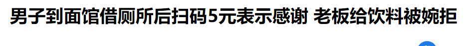 “都是讲究人!”近日,黑龙江,一男子带着孩子到餐馆借用厕所,然后毫不犹豫的给店家扫了5元,店家连忙拒绝,可男子还是付过去了,店家急忙拿了瓶饮料给孩子,却让男子连连摆手拒绝,网友:这才是格局打开了! 在这个匆匆忙忙的日子里,人们的小小善意经常就体现在那些不起眼的小事儿上。就说黑龙江有位爸爸,有一天带着孩子出门,孩子突然想上厕所,急得不行。爸爸一看周围没有公厕,就赶紧带着孩子进了一家路边的餐馆,问能不能借用一下厕所。餐馆老板二话不说就答应了。 孩子上完厕所后,这位爸爸立马拿出手机,直接扫了店里的二维码,转了5块钱过去。老板一看,赶紧摆手,说这不用给钱,就是帮个小忙的事儿。但这位爸爸特别坚决,非要付钱,他说这是对老板好心的感谢。这事儿,真的让不少人心里暖暖的。店家心里很感激,就想送瓶饮料给孩子表达谢意。但男子连忙摆手说不用,他说给钱是因为尊重和感谢,不是想要回报。两人客气来客气去,但气氛一直很融洽。 旁边的人把这一幕拍了下来,传到网上后很快就火了,网友们都说:“这才是真正的大气!”没想到一个小小的厕所,能让人感受到人与人之间的温暖。