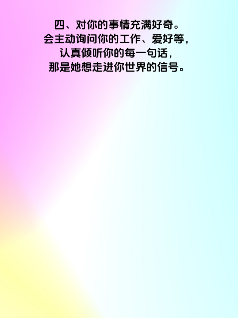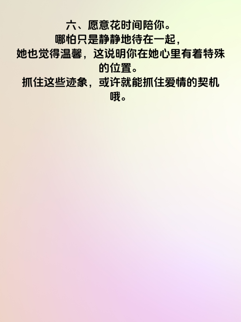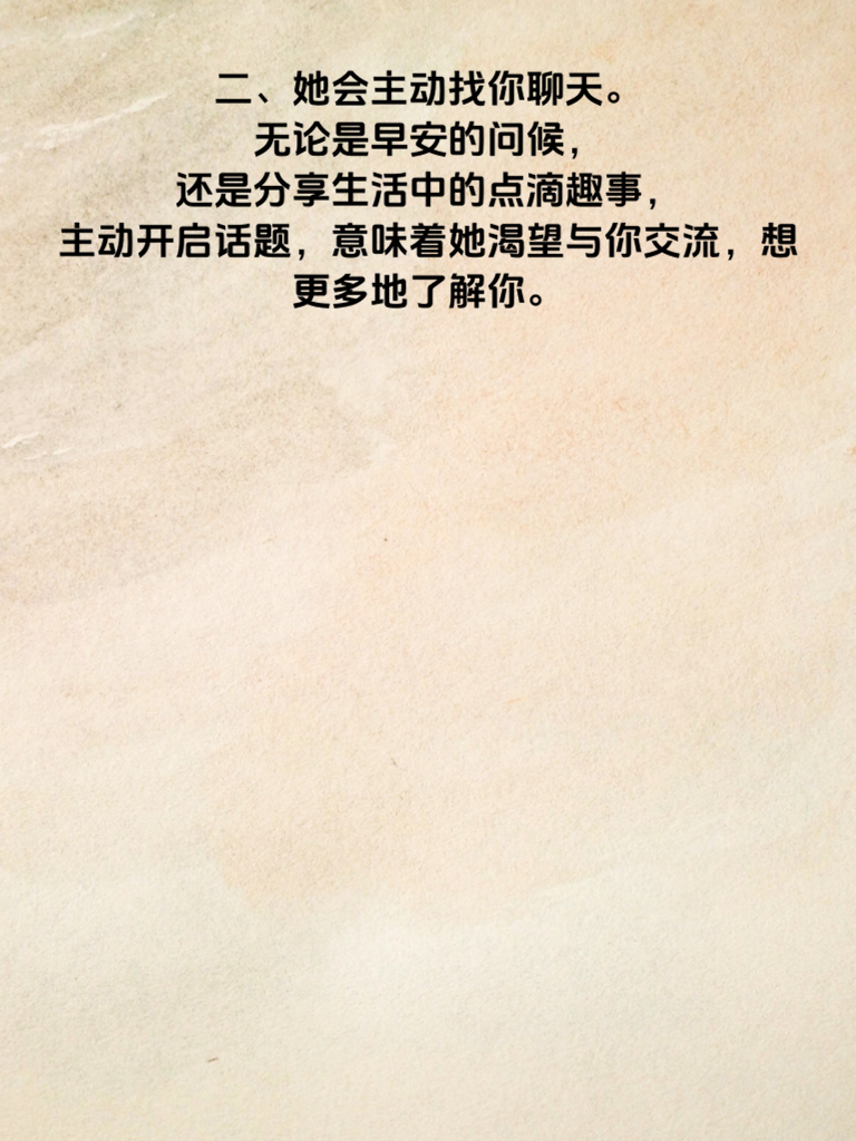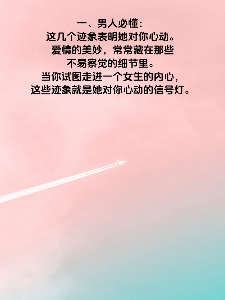 一、男人必懂:这几个迹象表明她对你心动。爱情的美妙,常常藏在那些不易察觉的细节里。当你试图走进一个女生的内心,这些迹象就是她对你心动的信号灯。 二、她会主动找你聊天。无论是早安的问候,还是分享生活中的点滴趣事,主动开启话题,意味着她渴望与你交流,想更多地了解你。 三、和你相处时格外注意形象。精心打扮,力求在你面前展现出最好的一面,这是她在意你看法的表现。 四、对你的事情充满好奇。会主动询问你的工作、爱好等,认真倾听你的每一句话,那是她想走进你世界的信号。 五、在你面前容易害羞。眼神躲闪,脸颊泛红,这些不经意的小举动,其实是她内心对你有别样情愫的体现。 六、愿意花时间陪你。哪怕只是静静地待在一起,她也觉得温馨,这说明你在她心里有着特殊的位置。抓住这些迹象,或许就能抓住爱情的契机哦。