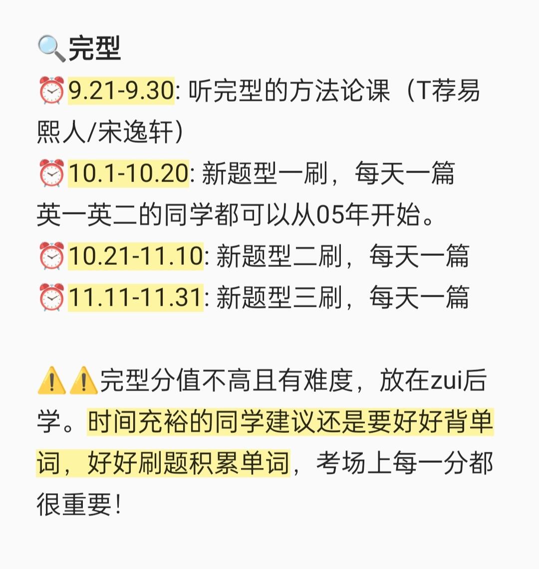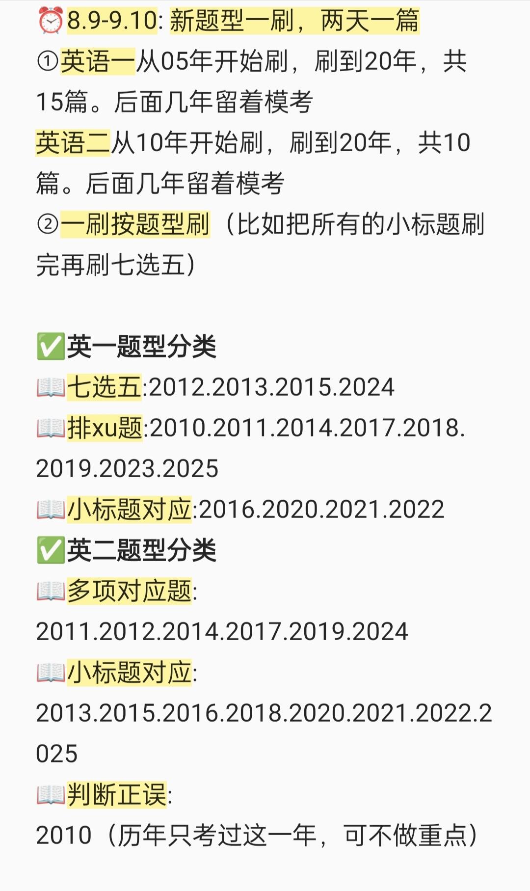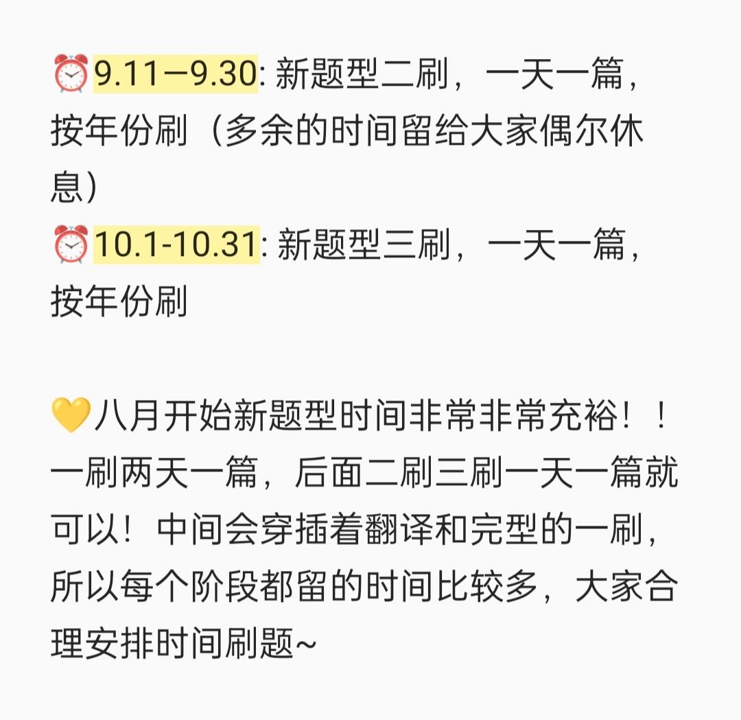 💛八月开始新题型时间非常非常充裕!!一刷两天一篇,后面二刷三刷一天一篇就可以!中间会穿插着翻译和完型的一刷,所以每个阶段都留的时间比较多,大家合理安排时间刷题~