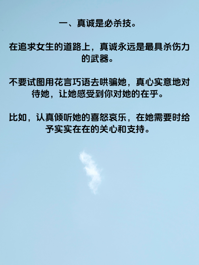 一、真诚是必杀技。在追求女生的道路上,真诚永远是最具杀伤力的武器。不要试图用花言巧语去哄骗她,真心实意地对待她,让她感受到你对她的在乎。比如,认真倾听她的喜怒哀乐,在她需要时给予实实在在的关心和支持。 二、自信的魅力无法挡。自信的男人浑身散发着独特的魅力。挺起胸膛,展现出你的自信风采,这会让她不自觉地被你吸引。但自信不是自负,要把握好度,在她面前适度展示你的能力和优点,让她看到你的闪光点。 三、懂得尊重她的想法。每个人都有自己的想法和观点,女生更是如此。尊重她的意见,哪怕与你不同,也不要急于否定。和她交流时,耐心倾听,然后再发表你的看法,这样会让她觉得你重视她,从而对你心生好感。 四、偶尔制造小惊喜。生活需要一些小惊喜来增添乐趣。偶尔送她一束鲜花,一份她心仪已久的小礼物,或者精心策划一次浪漫的约会。这些小惊喜会让她感受到你的用心,让她的心为你而动。