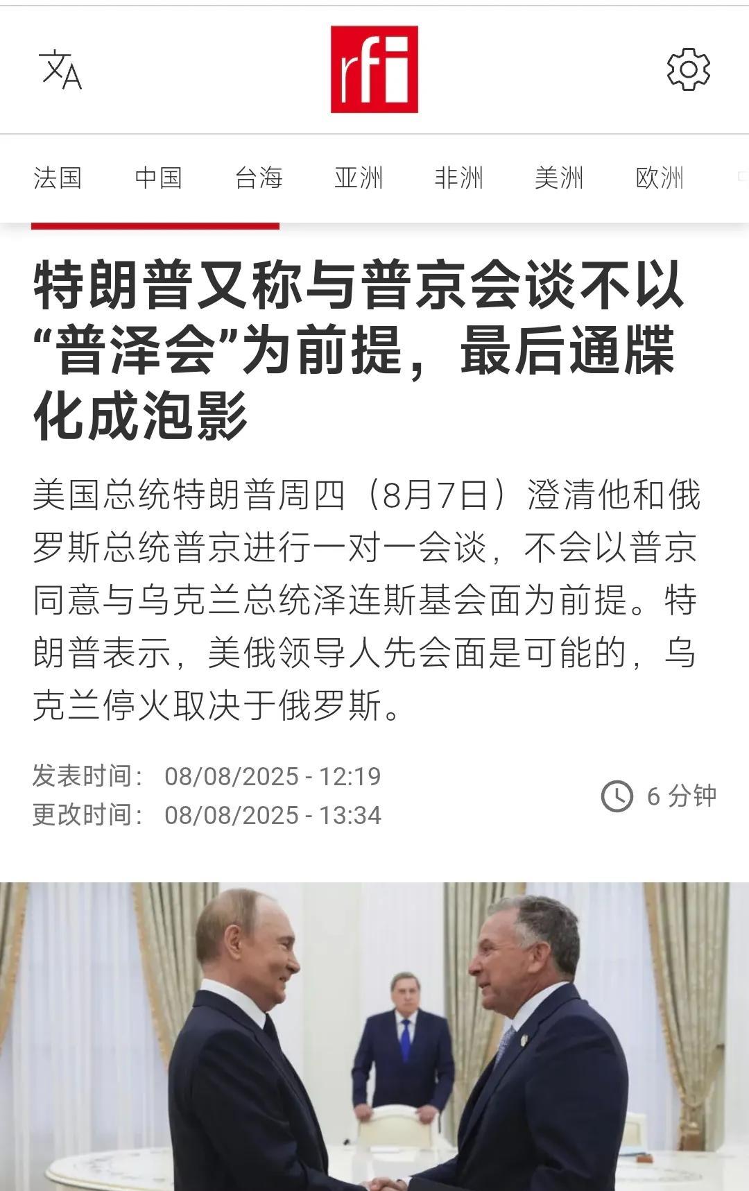 法媒今天(8月8日)报道:“特朗普又称与普京会谈不以‘普泽会’为前提,最后通牒化成泡影。特朗普澄清他和普京进行一对一会谈,不会以普京同意与泽连斯基会面为前提。特朗普表示,美俄领导人先会面是可能的,乌克兰停火取决于俄罗斯。” [机智]评几句:特朗普的最后通牒果然又再次烂尾了。有观点认为,特朗普当初对俄罗斯喊出10天最后通牒是为了转移前段时间美国国内对爱泼斯坦档案的高度关注。这种政治把戏,看似高明实则拙劣,妄图靠施压俄方来凸显自身“政绩”,却不知国际事务岂容这般儿戏,最终只会沦为又一次TACO。