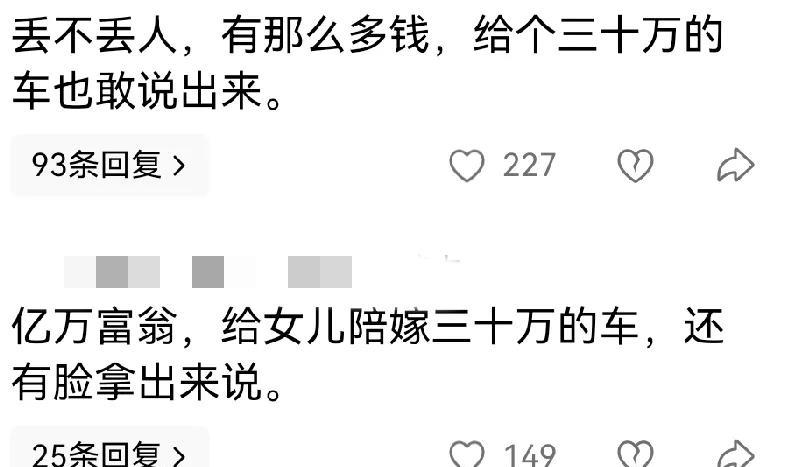 李连杰大女儿结婚,李连杰给了一辆30万的车当嫁妆,评论区直接沦陷了! 李连杰的大女儿李思,今年已经37岁了,参加过女团的海选,但并没有进入娱乐圈发展,很少露面,私生活也从没对外透露过。 李思这个年纪结婚已经算是晚婚了,不过她早年忙着学业和工作,现在工作稳定下来了,所以才把结婚提上日程。 而李连杰作为一个身家上亿的大明星,大女儿结婚他给的陪嫁是一辆30万的车,网友们顿时就不满了,觉得李连杰太小气了,这就和普通人嫁女儿陪嫁一双袜子一样。 所以李连杰的评论区几乎全都是网友们骂声,有说他小气的,又说他偏心的,还有说他丢人的,总之这一波他的路人缘算是掉得差不多了。 不过小编觉得,李连杰给大女儿的陪嫁应该不止一辆车吧,特别是最近一两年他和大女儿关系逐渐缓和,来往密切,大女儿结婚他肯定不会只陪嫁一台车这么小气的。 大家觉得呢?#头号创作者激励计划#
