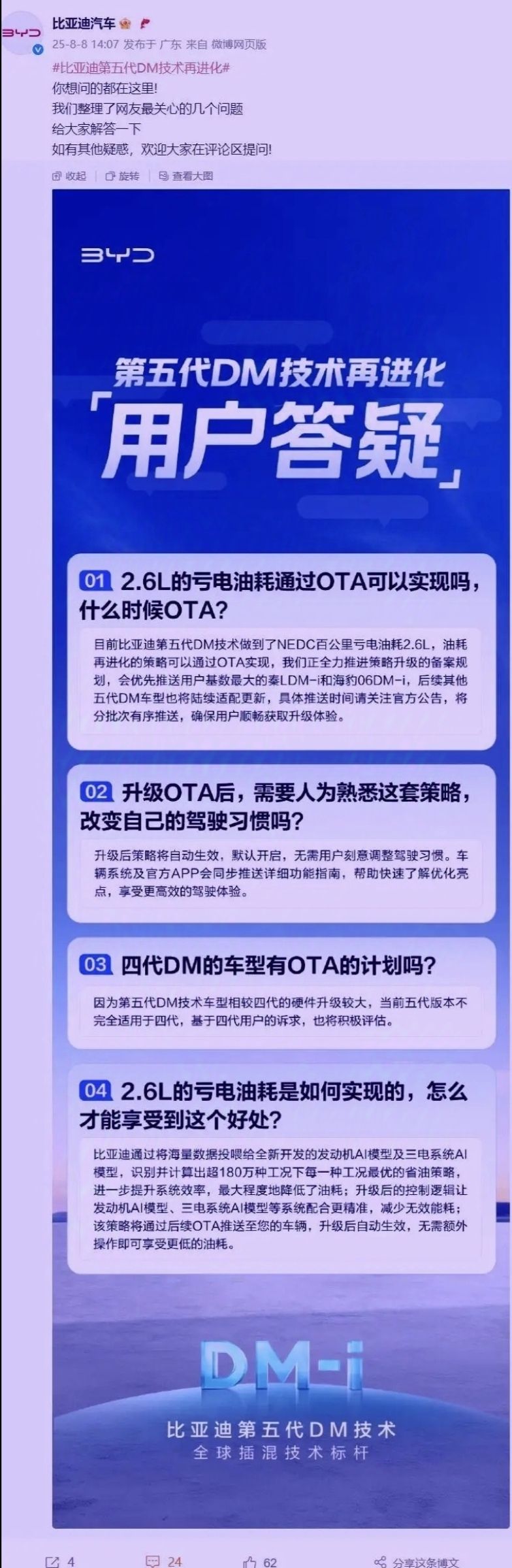 确认了!再次强调一下,王传福这已经不是挑战行业底线了,而是直接让BYD得罪了整个行业。本以为公布的第五代DM经过100家媒体测试百公里油耗都低于2.4L已经是王炸了,但是当BYD选择把第五代NEDC油耗2.6L技术下放以及通过OTA升级到其他车型上的时候,才知道谁才是真良心啊!