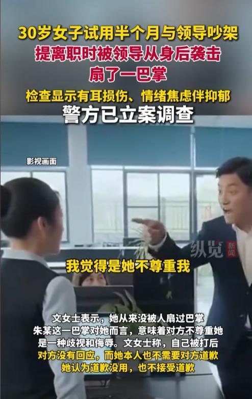 “太猖狂了!”浙江嘉兴,一女子通过招聘进入一家企业工作,然而,刚进入企业不久,就和一名女领导发生口角!女子打算申请离职,却没想到,这位女领导出现在女子身后,狠狠地打了一巴掌,导致女子耳损伤!警方:已立案 根据纵览新闻8月7日的报道,浙江嘉兴出了一件让人听着就气愤的事儿,30岁的文女士,从贵州来到嘉兴打拼,通过网络招聘平台,进入了一家和物业相关的私企,做财务方面的工作,本想着能开启新的职业生涯,可谁能料到,等待她的却是一场噩梦。 文女士才刚入职半个月,还处在试用期呢,就因为工作上的事儿,和公司行政方面的女领导朱某在线上吵了一架。 这一吵,文女士心里就有了疙瘩,打算8月4日去公司提离职,可她怎么也想不到,这一天,不是她顺利提出离职,而是遭遇了更大的屈辱。 就在文女士还没来得及开口提离职的时候,朱某竟然从她身后冲过来,狠狠地给了她一巴掌,这一巴掌,把文女士打懵了,她怎么也想不到,身为领导,朱某怎么能做出这种事。 文女士后来哭诉,自己长这么大,从来没被人扇过耳光,这一巴掌,对她来说,不仅仅是身体上的疼痛,更是一种人格上的侮辱,是对她极大的不尊重。 被打之后,文女士身体出现了各种不适,她请了病假赶紧去医院检查,嘉兴大学附属医院嘉兴市第一医院的门诊病历上记录着,文女士半月前新入职后,因为工作上的事儿情绪本就低落,事发当天和领导发生肢体冲突后,紧张害怕的情绪加重,整个人都在发抖,根本没办法正常工作,晚上睡觉也睡不好,老是惊醒,连吃饭都没胃口了。 再看医院的伤情检查通知单,诊断意见是外伤后耳鸣、耳损伤,精神检查及量表评估提示她情绪焦虑伴抑郁,这和应激性事件相关,甚至还存在“闪回”症状,最后诊断为“急性应激反应,焦虑抑郁状态”。 文女士觉得这件事不能就这么算了,于是第一时间就向当地的桐乡市公安局濮院派出所报了警,好在警方效率很高,当天就立案了。 后来记者致电派出所了解情况,派出所也确认已经立案,正在调查这件事,事情发生后,文女士也向公司讨要说法。 公司负责人提出给她一定的经济赔偿,可文女士对公司给出的金额不满意,更对公司处理这件事的方式不满。 在文女士看来,公司这种想用钱了事的做法,根本没有正视这件事的严重性,也没有真正站在她的角度考虑。 所以,文女士决定,不接受公司的私下和解,她要通过法律手段来维护自己的权益,具体怎么处理,她选择相信警方的界定,甚至还考虑提起民事诉讼。 针对文女士说的这些情况是不是真的,记者多次联系该公司负责人,可截至发稿,都没得到回复。 这件事被报道出来后,网友们都炸锅了,大部分网友都觉得,在职场上,就算有再大的矛盾,也应该坐下来好好沟通、协商解决,怎么能动手打人呢? 更何况朱某还是领导,更应该以身作则,好好管理自己的情绪,展现出应有的专业素养,有网友直言,就应该让施暴者被拘留五天,留个案底,这样才能真正起到警示作用。 但也有网友比较理性,提醒大家,要是公司要求文女士提供被殴打的证据,当时事发突然,文女士可能根本没机会录像取证,这就给维权带来了很大的困难。 网友们的这些不同观点,其实都反映出大家对暴力行为的谴责,以及对弱势群体维权难的担忧。 职场本应是大家努力工作、实现价值的地方,而不是发生暴力冲突的场所,这起事件,不只是文女士个人的遭遇,它反映出职场中可能存在的一些问题。 我们希望,类似的事情不要再发生,也期待警方能公正处理这件事,给文女士一个公道。 大家对此事怎么看呢?欢迎在评论区留言讨论。 信息来源:纵览新闻2025年8月7日《30岁女子试用半月与领导吵架,提离职时被领导从身后袭击。》