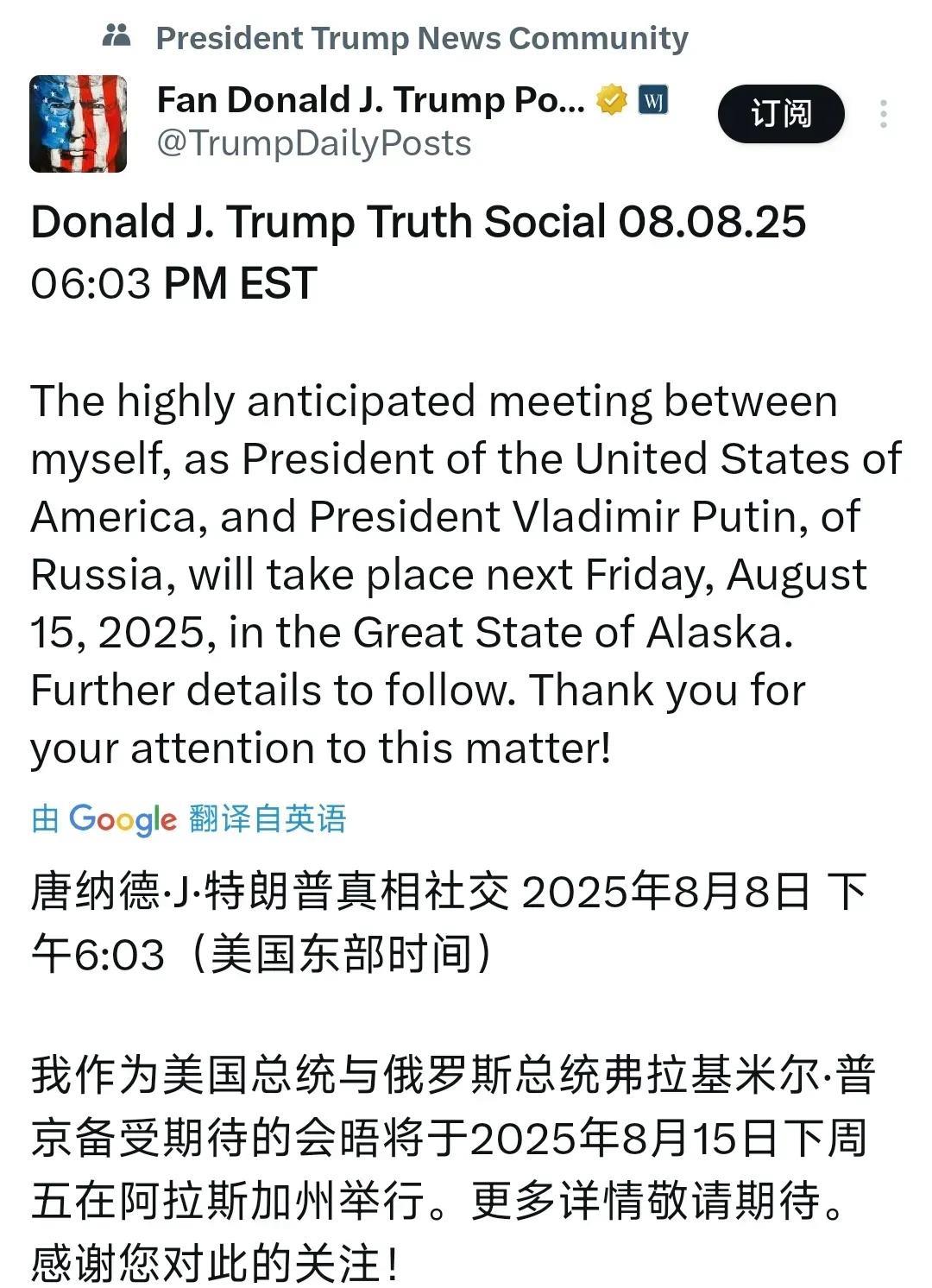 特朗普今天(8月9日)宣布,美俄领导人将于8月15日下周五在阿拉斯加州举行会晤;俄总统助理乌沙科夫也证实了该消息,并表示下一次俄美领导人会晤将在俄罗斯举行。 这日子选得不错,恰逢日本法西斯无条件投降80周年纪念日。现在欧公子低下了头,欧小姐再没有往日的喧闹,演员仅仅发出请国际社会“不要承认俄占领土为俄领土”的哀叫。历史殷鉴不远,棋子终将成为弃子,现在小马科斯还在跃跃欲试。