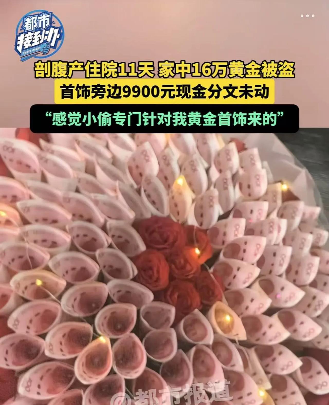 河南驻马店,女子剖腹产住院11天,家中价值16万的黄金首饰被盗,可是放在旁边的9900元现金花却分文未动!女子:感觉小偷专门针对我的黄金首饰来的,我害怕是最亲近的人!网友:熟人不用想,报案,民警会挨个谈话,能查出! 潘女士声泪俱下地向记者哭诉:“我万万没想到,在我住院最虚弱、最需要安心养病的日子里,小偷竟然会趁虚而入,把我心爱的黄金首饰给偷走了!” 潘女士和老公租下了一栋三层楼的民房,开起了理发美容店。老公在一楼理发,她则在二楼专注美容。而三楼,便是他们居住的地方。 6月11号,潘女士去医院进行剖腹产。为了安心待产,她把自己平日里佩戴的黄金首饰小心翼翼地摘下来,放进床头柜上的首饰盒里。 可是6月21号,潘女士从医院回到家,却发现首饰盒空空如也。里面原本放着金项链,平安扣。还有一个金镯子,这些首饰加起来足足有167克,按照当下的金价计算,价值高达16万多。 更让人觉得离奇的是,首饰盒旁边就摆放着一束用9900元现金包裹的花,可小偷却对这笔现金视而不见。 按常理来说,如果小偷是为了求财,直接把钱拿走岂不是更加便捷、风险更低?毕竟拿了黄金还需要想办法变现,风险太大。 因此,潘女士不禁怀疑,这个小偷很可能是身边的熟人,是专门冲着她的首饰来的。 好在楼梯口安装了一个监控,记录下了这期间一共有25个人上下楼。可是,这25个人中,到底谁是那个可恶的小偷,却难以确定。 目前,警方已经立案,对现场进行了细致的指纹提取工作,案件正在紧锣密鼓地调查当中。 潘女士说:“这些首饰都是我辛辛苦苦赚钱给自己买的,一年365天,我加起来只休息四五天。黄金被偷后,我一个月就瘦了37斤,我担心是熟人干的,也不敢跟我父母说,怕他们跟着操心。如果能找回来,我愿意将50%的钱捐给社会,我不想让小偷得逞。” 此事引发了热议,有网友说, 其实第一感觉,就是他老公拿的……我就是被偷过,当票还在我手上,十几年了。 也有网友说,盒子上有指纹啊,除了你,盒子上的其他指纹采集下来就知道是谁了! 还有网友说,如果是小偷,那么多现金放那里,又不重,还能不拿?又不是傻子。失主既然说要拿出一半捐出去,也可能是本来心里就觉得是自己人干的,只是气愤苦无证据,所以如果能找到宁愿捐出去…… 在这起令人痛心的失窃案中,我们看到的不仅仅是潘女士个人的财产损失,更是社会安全与信任的缺失。如果连身边的人都不能信任,我们的社会将变得多么冰冷与可怕。 相关部门必须加大打击犯罪的力度,让每一个违法者都受到应有的惩罚!