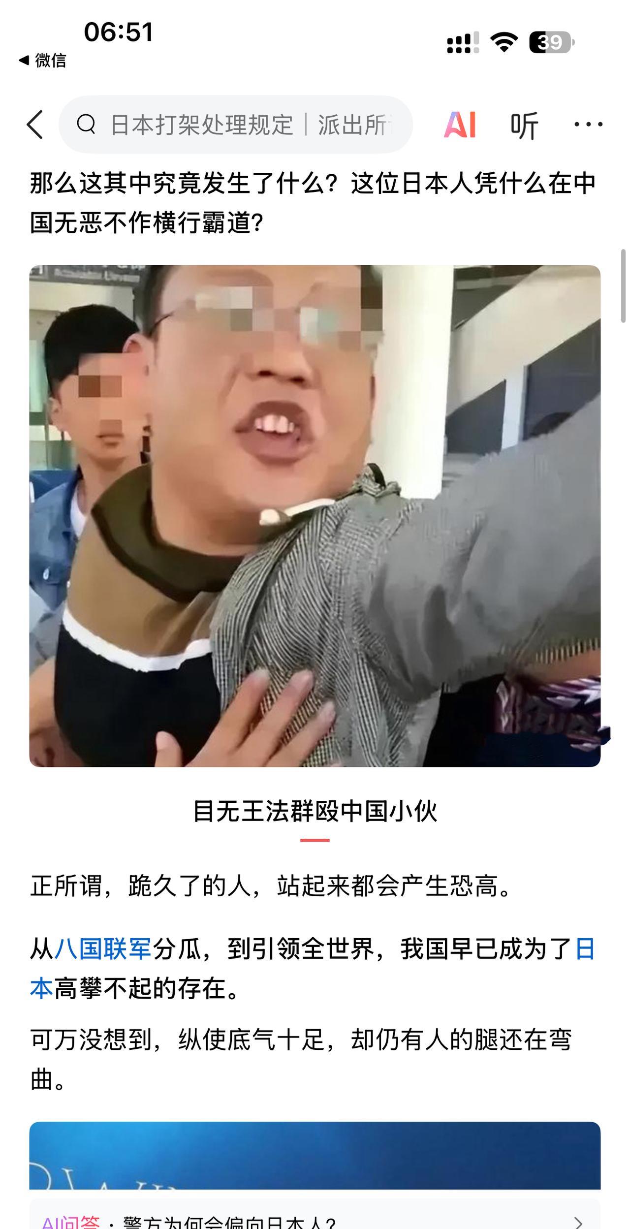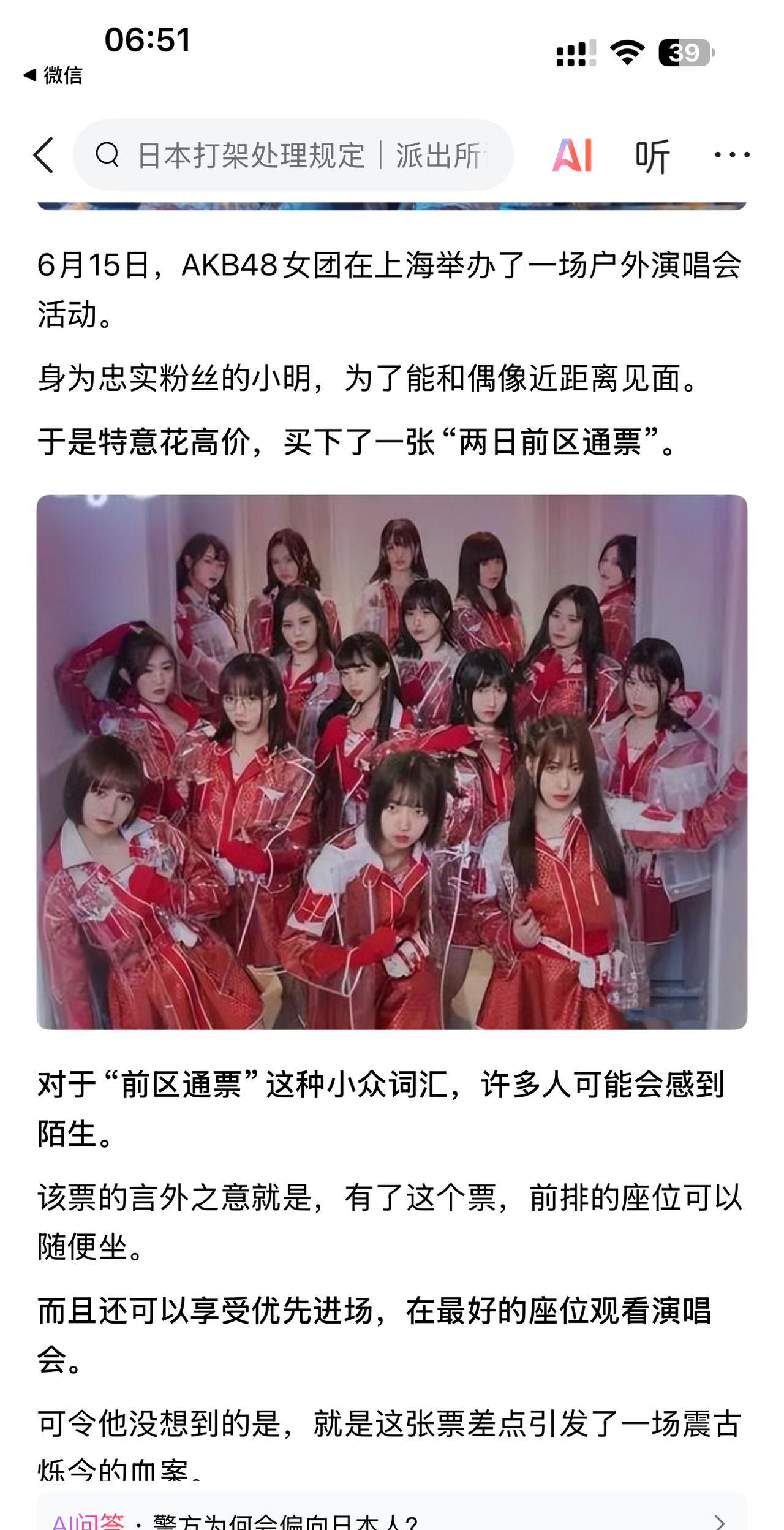 日本人在上海群殴中国男子,态度嚣张拒绝赔偿,扬言再也不来中国! 近日,一起发生在上海AKB48演唱会现场的暴力事件在网上引发轩然大波。 一名中国观众因座位问题遭到多名日本工作人员的围殴,而后续处理结果更是让无数网友愤慨不已。 事发当天,购买了高价"前区通票"的小明早早来到现场,希望能近距离观看偶像表演。 等待他的却是一场噩梦般的遭遇。据现场目击者描述,日本工作人员不仅让本国观众优先选座,还默许了多名未购买通票的日本观众插队。 当小明试图在第二排就座时,竟遭到多名日本工作人员的阻拦和言语侮辱。 "他们突然就动手了,先是用肘击,接着就是拳打脚踢。"小明回忆道,"有人从背后锁住我的脖子,我感觉快要窒息了。" 现场保安在制止冲突后,竟要求受害者向施暴者道歉。直到有观众报警,这场持续近十分钟的暴力行为才得以终止。 警方到场后,涉事日本工作人员态度依然嚣张。 监控视频清晰记录了整个殴打过程,但施暴者不仅拒绝道歉,还反咬一口将责任推给小明。 最终在多方压力下,他们才勉强凑出1888元作为"赔偿",其中还包括了医疗费用。 "这不是钱的问题,而是尊严问题。" 小明在社交媒体上发文表示,"在中国的地盘上,日本人凭什么可以这样肆无忌惮?"他的遭遇迅速引发网友热议,相关话题阅读量短时间内突破千万。 有知情人士透露,带头打人的是AKB48团队的一名日方经纪人。 该人士在日本就以态度恶劣著称,没想到在中国依然我行我素。更讽刺的是,这些施暴者在"赔偿"后竟大摇大摆地返回演唱会现场,还扬言"再也不来中国"。 事件发酵后,网友们纷纷质疑警方的处理方式。 根据我国《治安管理处罚法》,多人殴打他人已涉嫌寻衅滋事,理应受到法律制裁。而1888元的"和解金"与受害者遭受的身心伤害明显不成正比。 "这不是简单的民事纠纷,而是涉及国家尊严的事件。"一位法律专家指出,"在中国境内,任何外国人都必须遵守中国法律,没有特权可言。" 这起事件也引发了关于追星文化的反思。 有网友表示:"我们欢迎各国艺人来华演出,但必须遵守中国的法律法规。粉丝的热情不该成为某些人肆意妄为的资本。" 截至发稿,AKB48官方尚未就此事作出回应。而涉事日本工作人员是否会被追究法律责任,仍有待相关部门进一步调查。 各位读者,您如何看待这起事件? 外国艺人在华演出时是否应该享有特殊待遇? 欢迎在评论区留下您的观点。同时也要提醒大家,追星需理性,遇到不公待遇时要勇于用法律武器维护自身权益。