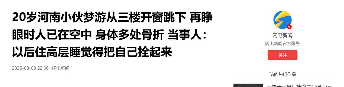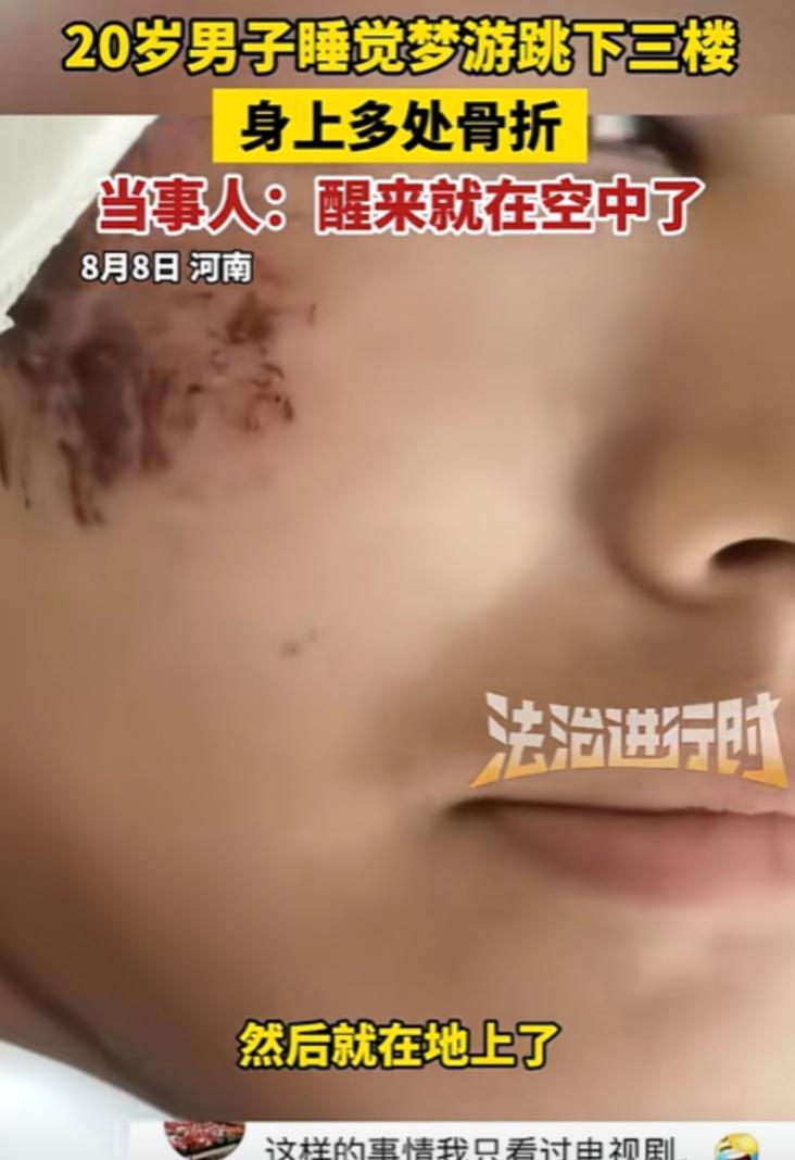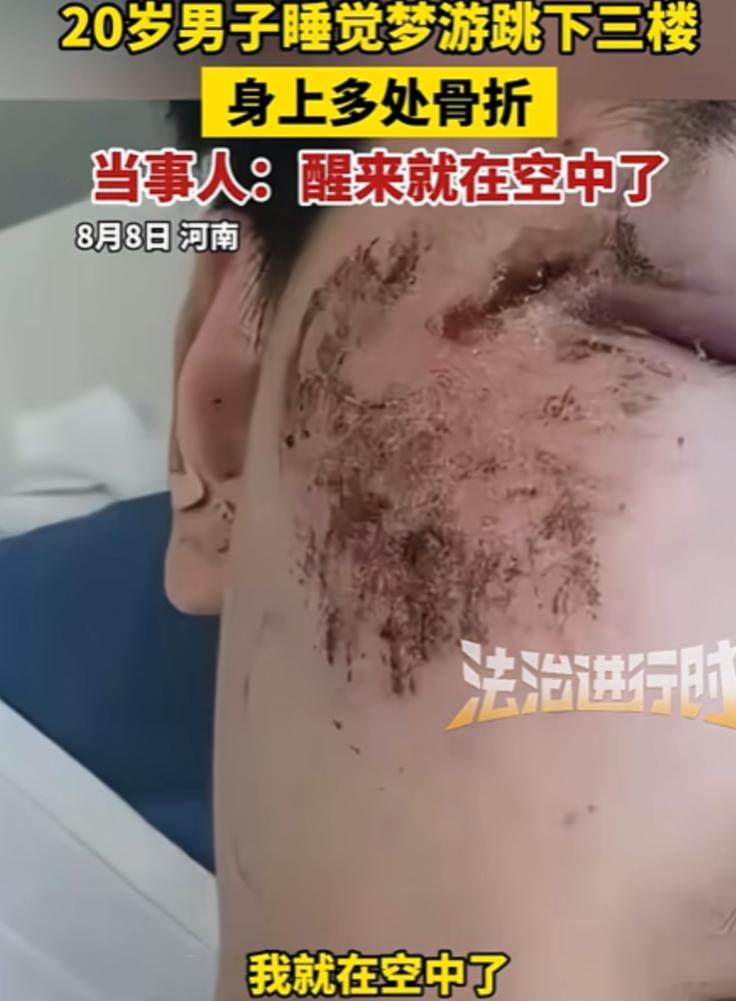 “解释不清了!”河南,20岁小伙晚上睡得正香,迷糊中感觉耳边有风,他猛然一睁眼,发现自己竟然半空中,然后就狠狠摔在地上,被送到医院后,诊断为全身多处骨折,脸也破相了!男子自己都懵:我醒来就在空中了! 这事儿说出来你可能都不信,河南郑州有个 20 岁的小伙子姓曹,好好睡着觉突然就出了大事,那天晚上小曹睡得正香,迷迷糊糊间就觉得耳边有风,凉飕飕的。 他心里还纳闷呢,这窗户关没关啊?猛地一睁眼整个人都懵了,自己居然在半空中悬着!还没等他反应过来,身体就不受控制地往下掉,“咚” 的一声狠狠砸在地上,疼得他当场就喊出了声。 同住的堂哥和旁边的邻居听见动静,赶紧跑出来看。,见小曹光着脚躺在楼下,身上好多地方都受了伤,脸上也淌着血看着就吓人。 大伙儿赶紧把他送医院,检查结果一出来,医生说全身好几处骨折,股骨、盆骨都伤着了,脸上也划了大口子缝了好几针。 躺在病床上小曹自己都想不明白这到底是咋回事,他就记得前一天工作特别累,从早到晚干了十四个小时,累得回到出租屋,连脱衣服的劲儿都没有,往床上一倒就睡着了,睡得那叫一个沉。 后来医生一分析,说这是梦游了,小曹这才想起,自己小时候确实有过这毛病,可都好些年没犯过了,怎么偏偏这时候就出事了呢?医生说估计就是因为太累了,身体扛不住了,才把这老毛病给勾出来了。 你说这事儿邪乎不邪乎?就因为太累,睡梦中脑子一糊涂,居然就走到窗台边,然后掉了下去。小曹自己都觉得解释不清,好好的怎么就做出这种事了呢? 这场意外可把小曹坑惨了,在医院一住就是九天光医药费就花了四万多,医生说想彻底好利索,最少也得半年到一年的时间,这对于一个才 20 岁的小伙子来说打击可不小,原本好好的生活节奏全被打乱了。 想想看多不值当啊,就为了多干点活儿,把自己身体折腾成这样,其实不光是小曹,现在好多人不都这样吗?总觉得自己年轻身体扛得住,为了工作,为了挣钱就使劲熬,觉也不睡够。 真别拿自己的身体不当回事,该休息的时候就得休息,别总硬撑着,你有多久没好好睡一觉了?要是很久了,那就赶紧找个时间,把手头的事放一放,踏踏实实睡上一觉,毕竟身体是咱的本钱,没个好身体啥也干不成,你说对吧? (信息来源:闪电新闻——20岁河南小伙梦游从三楼开窗跳下 再睁眼时人已在空中 身体多处骨 折 当事人:以后住高层睡觉得把自己拴起来)
