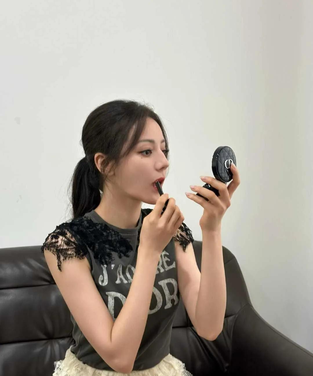迪丽热巴×DIOR新造型蕾丝拼接+高马尾,这波时尚感拉满! 拿着DIOR彩妆补妆